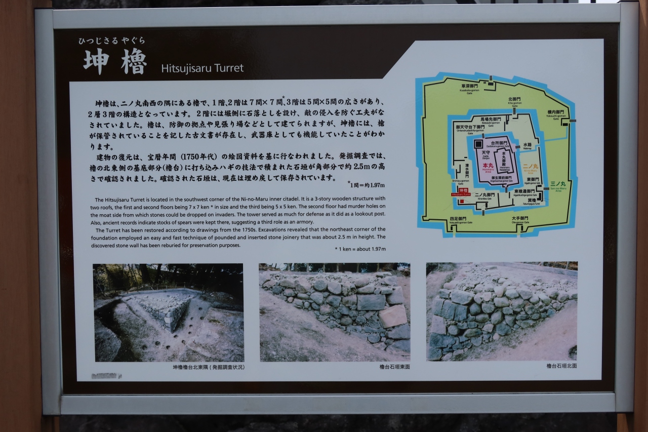 駿府城公園の南東部角の濠に面した場所にある櫓が坤櫓です。4年前に復元した二層三階の隅櫓で、有料ですが内部を見学することができます。木造で復元されており、一部はガラス張りになっているため当時の櫓の構造が手に取る様に分かります。