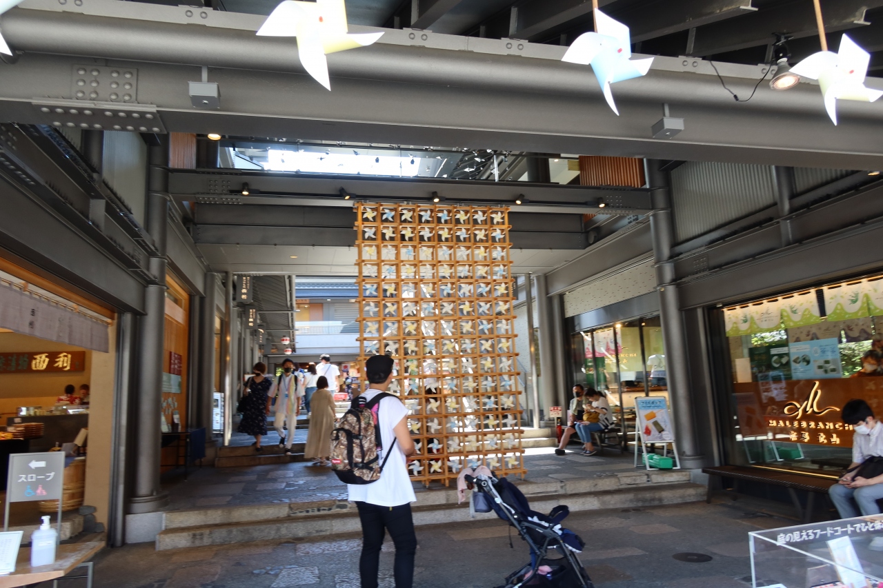 嵐電の嵐山駅の道を挟んで証文にある複合商店施設が嵐山昇龍苑です。茶の菓のマールブランシュ、漬物の西利、八ツ橋の西尾八ツ橋、香老舗の松栄堂などの京の老舗が集まった施設で嵐山でこれらの老舗の商品が買えるのが嬉しいです。行った時は風車の装飾が施され涼し気な雰囲気も良いです。