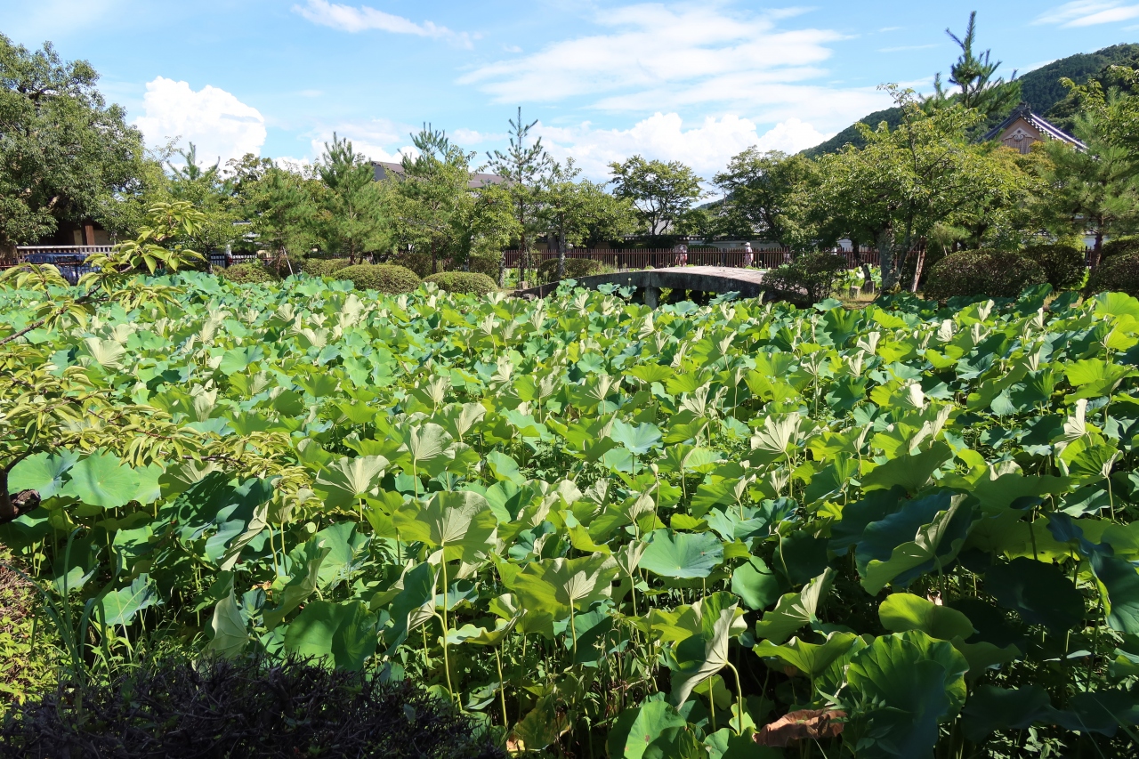 嵐電 嵐山駅に近い天龍寺の山門を入った先、駐車場になっている参道の脇に放生池があり、放生池には池一面にハスで埋まっています。初夏にはピンク色の大きなハスの花が見られるのですが、訪れた8月は花は終わっており、一面葉っぱだらけ。花を見に行くなら初夏の朝が良いでしょう。