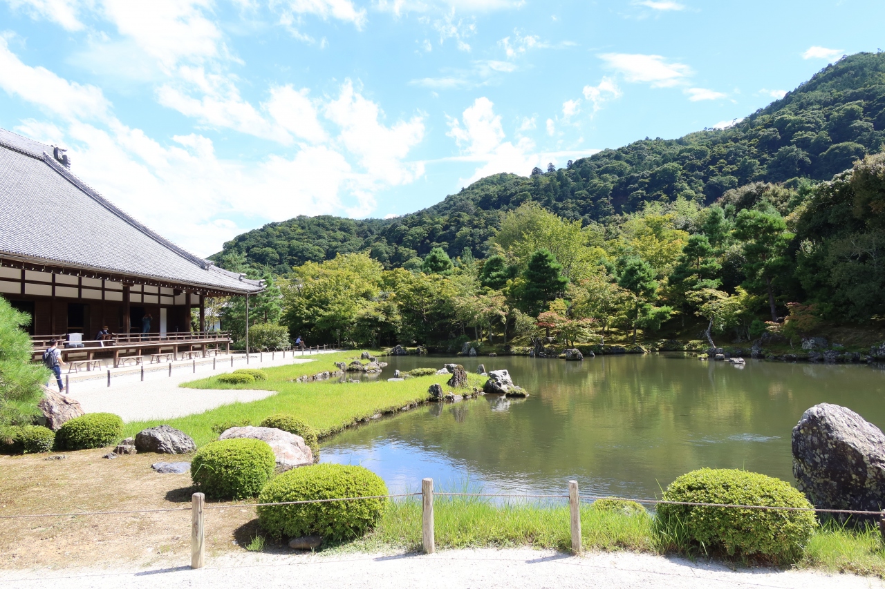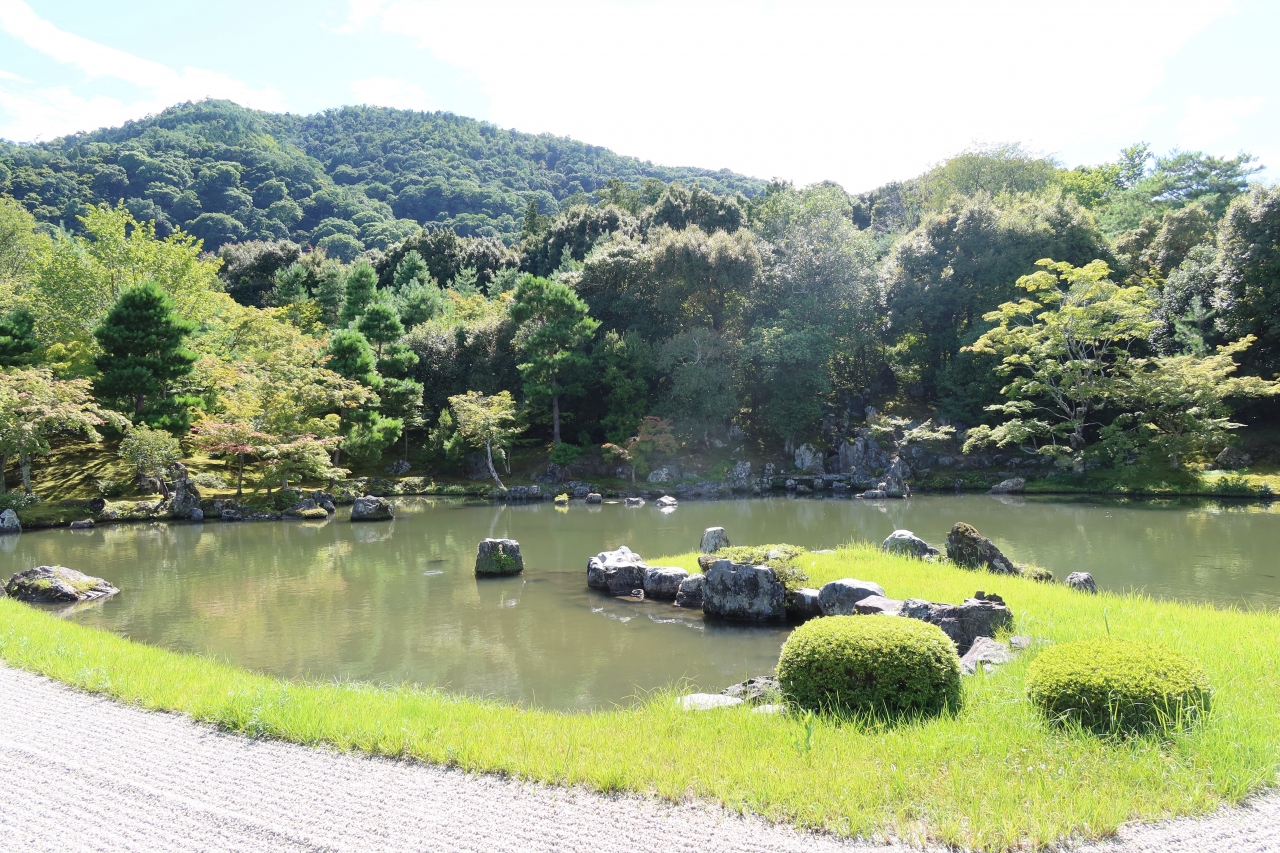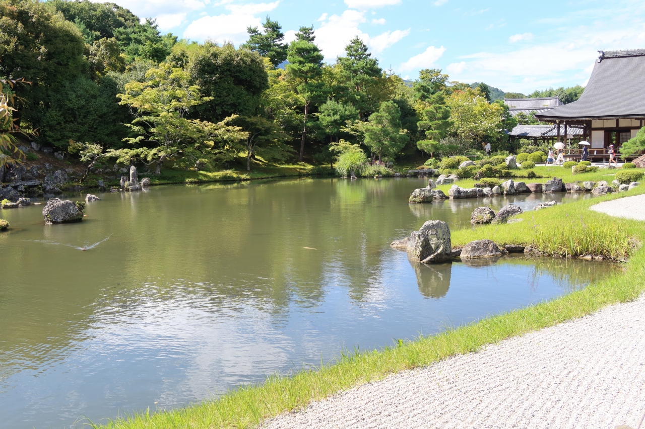 世界遺産に指定されている天龍寺の大方丈の前に広がる庭園が曹源池庭園です。日本で初めて特別名勝に指定された名庭園です。以前来たときは紅葉の時期で、それは美しい景色が観られましたが、夏も青々とした姿も良く、四季折々の景色が観られます。大方丈の縁側に座ってこの景色を見ると日本という国は美しい文化を持つ国なんだとつくづく思いました。