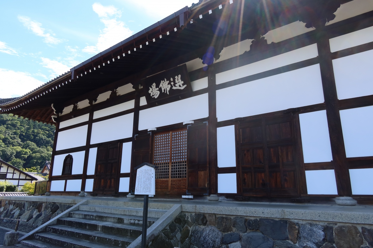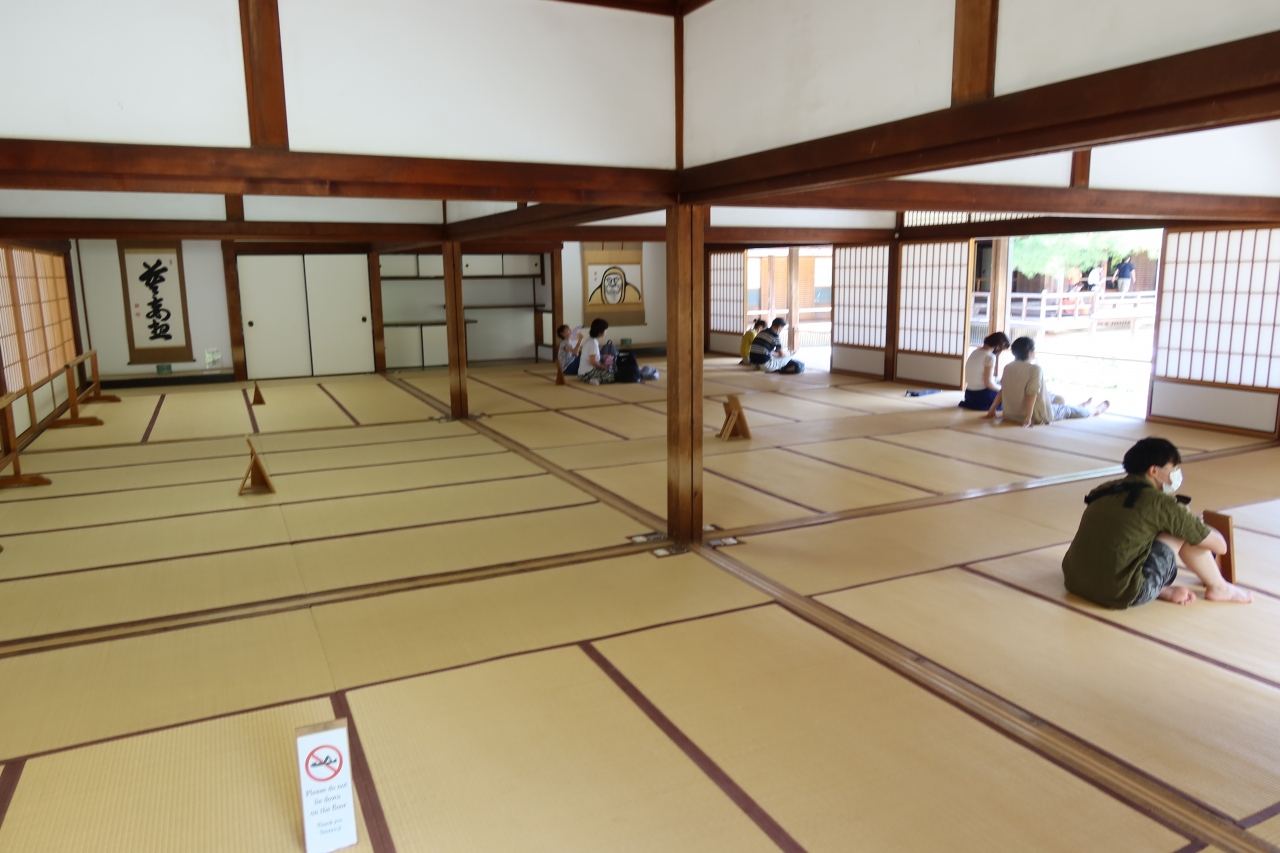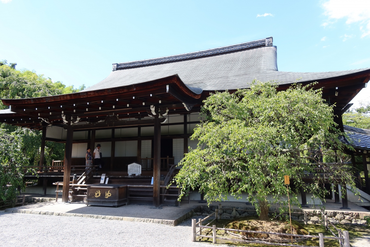天龍寺の大方丈の東に建つ建物が法堂です。瓦葺寄棟造りの法堂は雲居庵禅堂を移築再建したもので、天井の描かれた加山又造の八方睨み龍が有名です。しかし、特別参拝の期間しか見られず、さらに庭園、方丈とは別料金がかかります。今回は暑かったこともあり、外観だけの見学にしました。