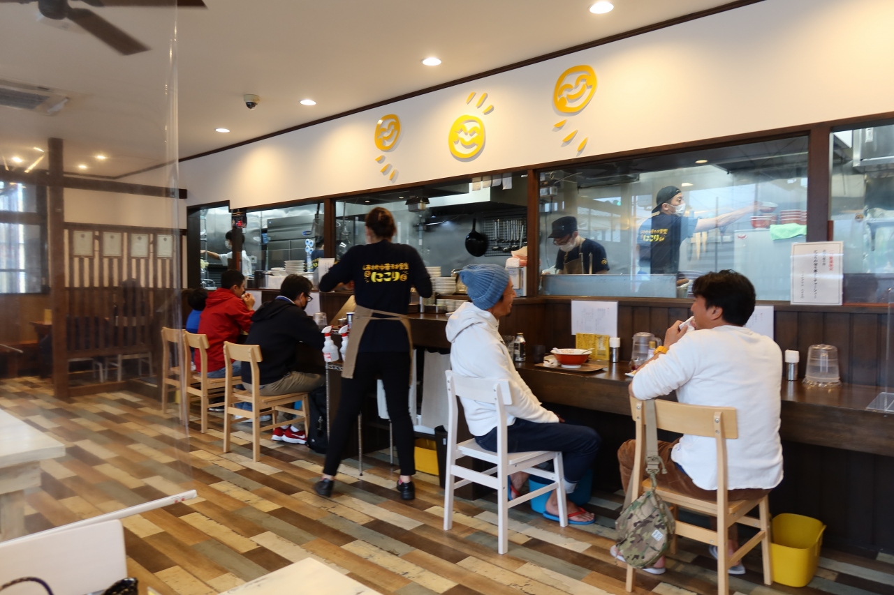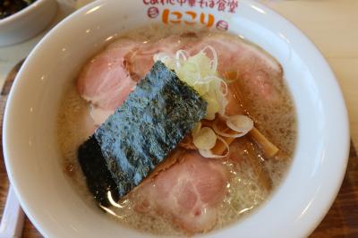 国道135号線 湯河原駅入口交差点から3,400m程行った交差点の角にしあわせ中華そば食堂にこりはあります。飯田商店に行きたかったですが、無理だったので、近くにあるこちらの店に行きました。頂いたのは背脂チャーシュー中華そば。煮干しの出汁が美味しいスープに背脂が入り、平打ち麺と相まって、とても美味しく、スープをすべて飲み干してしまう程。チャーシューは薄いですが、こちらも柔らかくて中華そばにピッタリ。また伊豆に行ったら立ち寄りたいお店です。