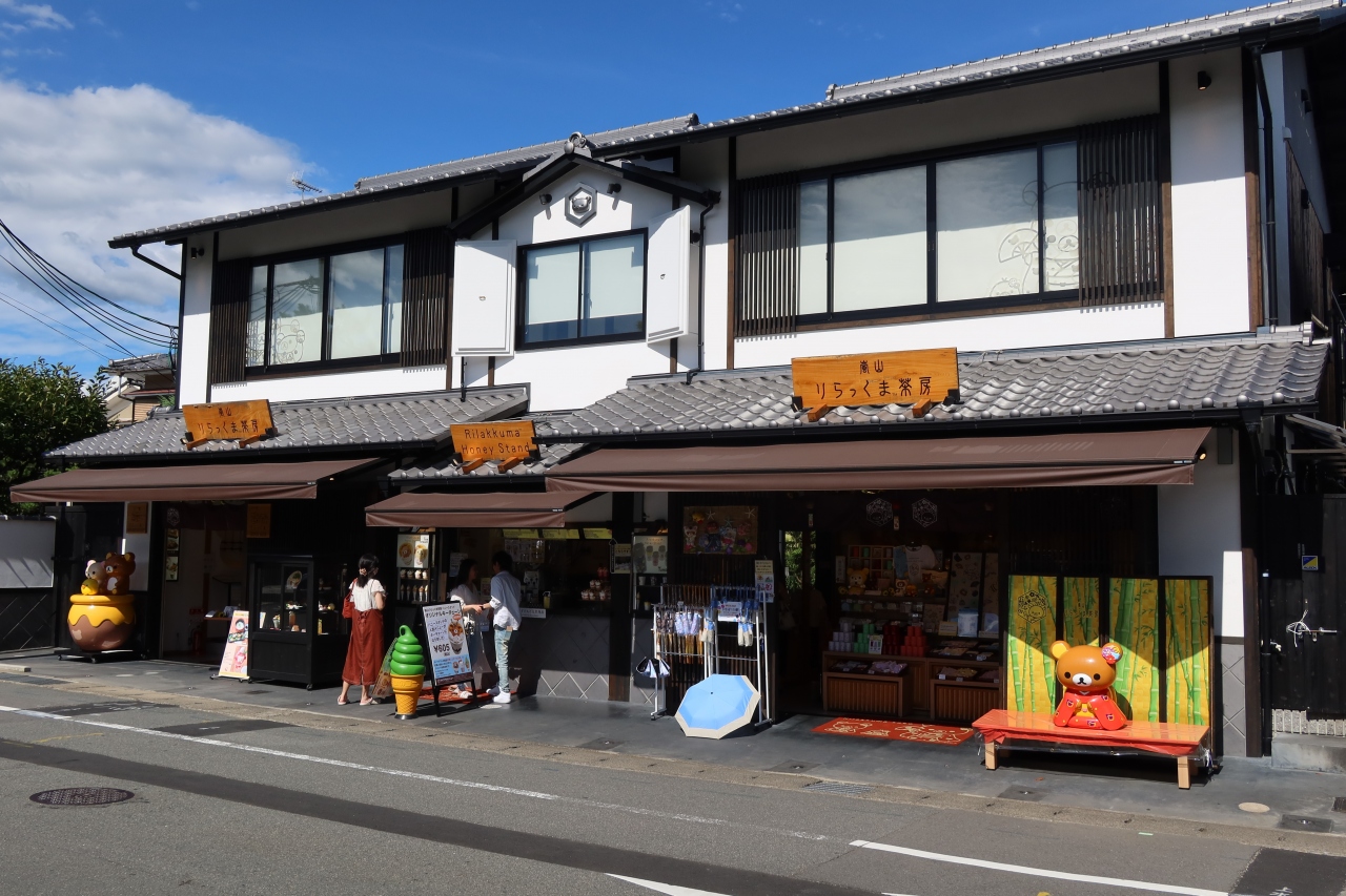 嵐電 嵐山駅を出て北に50m程行った天龍寺の対面に人気のキャラクター「リラックマ」の専門店 りらっくま茶房があります。2階がリラックマキャラクターのスイーツ、食事を頂けますが、何と言っても1階のリラックマグッズが豊富なのが魅力。京都ならではのグッズもあり大人から子供まで欲しい物が揃っており、リラックマファンには垂涎のお店です。