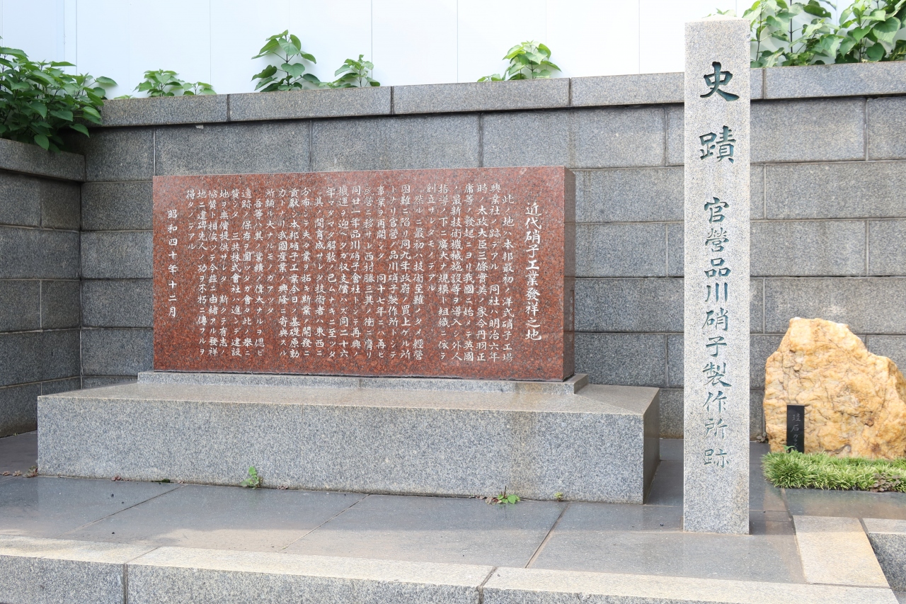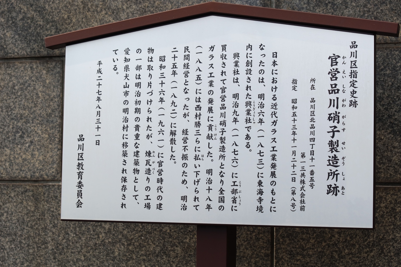 新馬場駅から山手通りを大崎方面に向かい、東海道線の高架を潜った右手に官営品川硝子製造所跡の石碑があります。聞いたことがある名前だなと思ったら、明治村で見学したレンガ造りの建物がこの場所にあったんだと分かりました。旅行で見学した建物や物が、別の場所で結びつくと面白い物です。