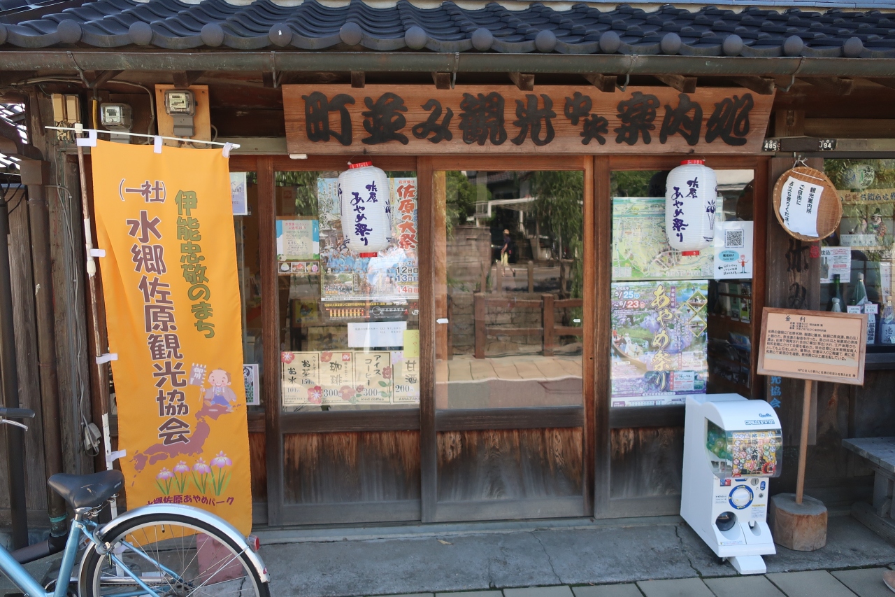 佐原観光の中心地、古い街並みが残る忠敬橋から北に入った小野川沿いに町並み観光中央案内処があります。金利と言う切妻平入2階建ての商家を利用した観光案内所で、佐原の街並み観光をする際に観光案内をしてもらえるのは勿論、お休み処としても利用できます。現地に観光案内所があるので、駅の観光案内所より便利です。