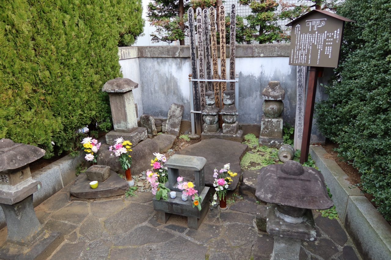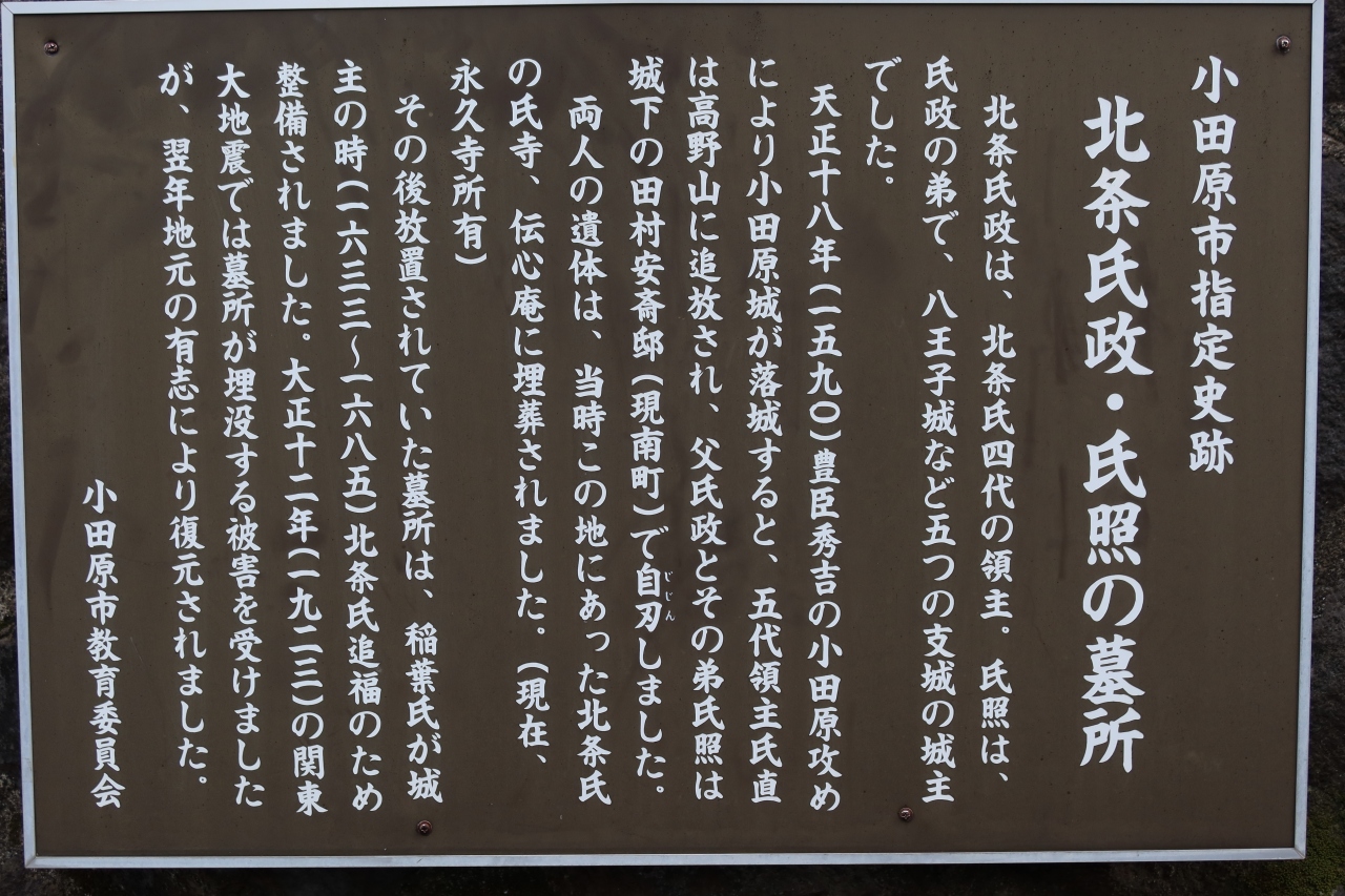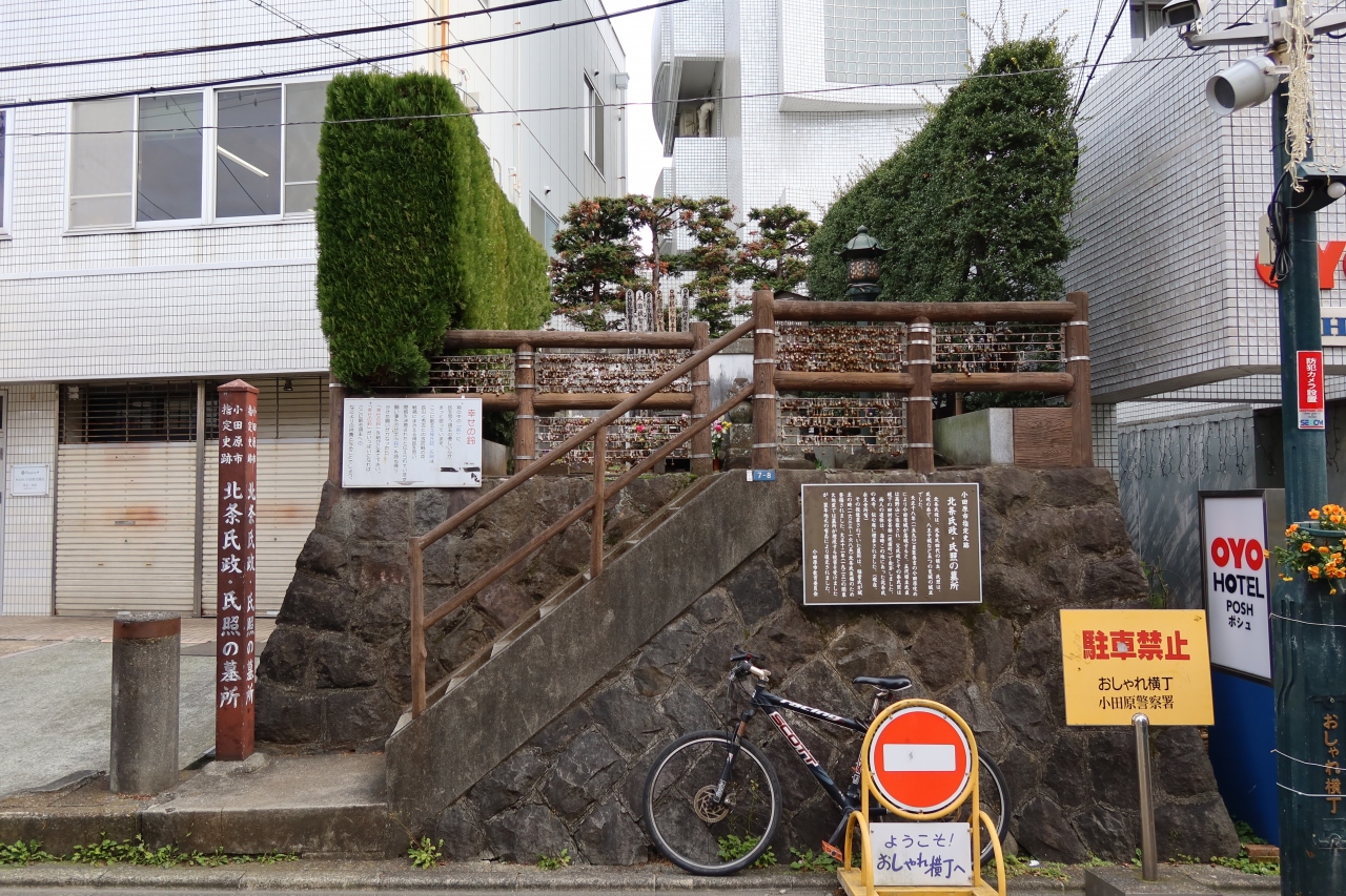 小田原駅の東口にある裏路地商店街 おしゃれ横丁の中にあるT字交差点の突き当りに豊臣秀吉と戦った北条氏政・氏照の墓所があります。石積みで一段高くなった墓所には大中小の五輪の塔があり、中央2つの塔が氏政・氏照の墓です。歴史上名のある武将の割には小さな墓石であることに驚きました。