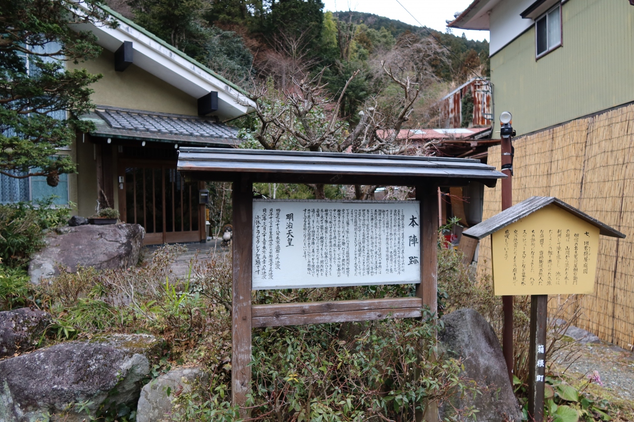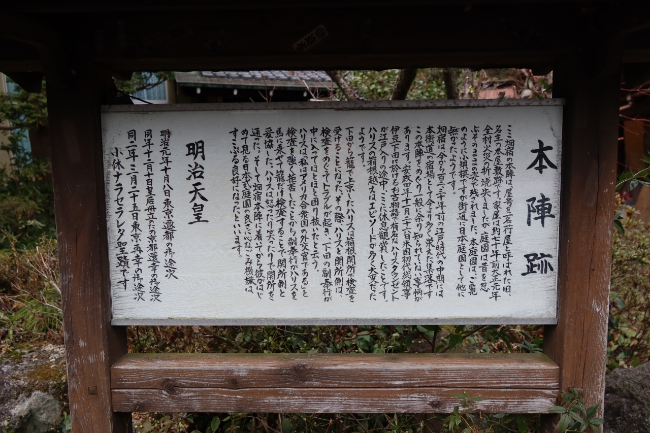 箱根畑宿の一里塚から旧東海道を150m程下った所の民家の入口に畑宿本陣茗荷屋跡の案内板があります。茗荷屋と言う屋号の名主の本屋敷跡で、建物は大正時代に焼失し現在は庭園しか残っていません。奥に入って庭園を見たかったのですが、民家の中にある様に見えたので入って良いのか分からず、じっくりとは見学できなっかたのが残念でした。