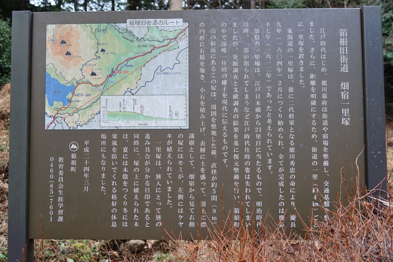 箱根の畑宿バス停のあるところから30m程登った旧東海道 石畳の手前に2つの大きな塚があります。これが畑宿一里塚です。一里塚は江戸時代の旧街道のあった場所で幾つか見たことはありますが、畑宿一里塚ほど昔の形を残しているものは見たことがなく、感心しました。塚の下側は石が積まれ、塚の上には木が植えられ街道に両側にある姿は初めて見ました。周りの景色も当時の様な雰囲気でとっても良いです。
