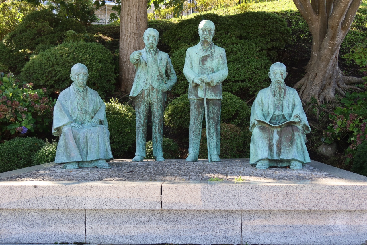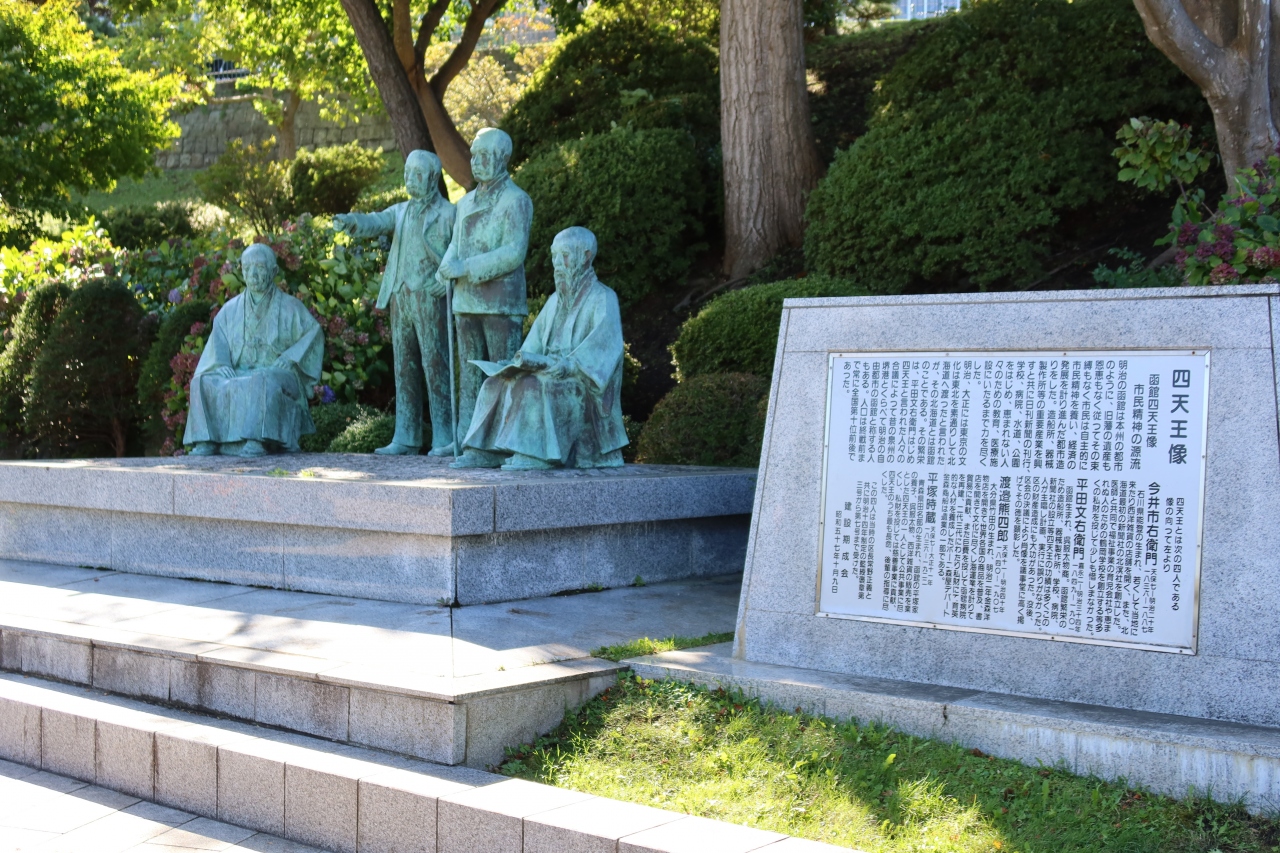函館の元町公園から基坂を下った左手にあるペリー広場の片隅にペリー提督来航記念碑が立てられています。ペリー提督が函館を訪れたのは1854年。2002年に来航150周年記念を迎えるのにあたりペリー提督の銅像が立つ記念碑が立てられました。