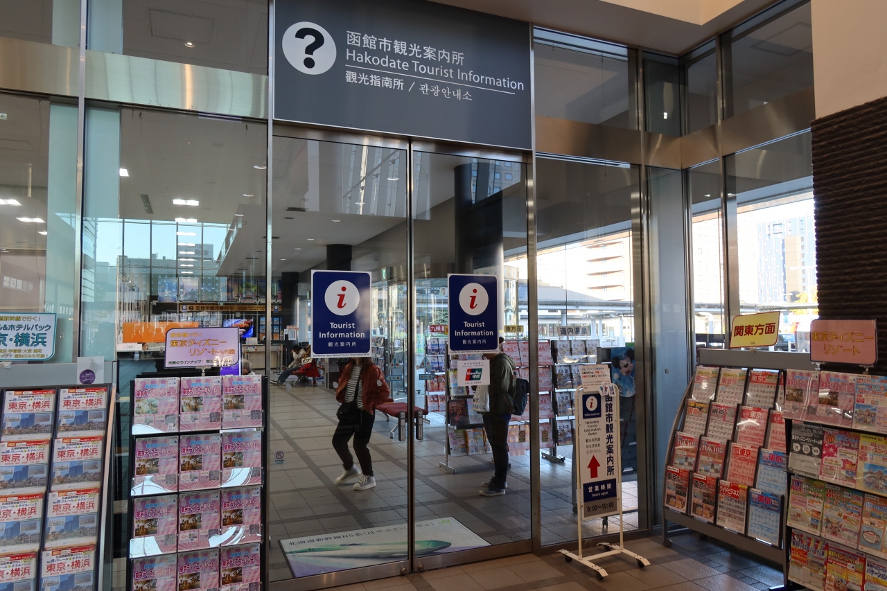 函館市観光案内所は函館駅に入って直ぐ右手、ツインクルプラザ函館の隣にあります。そのため一見、旅行センターの様に見えますが、中に入ると函館及びその周辺の観光パンフレットが置かれ、奥には相談窓口があり、相談員の人が居ます。