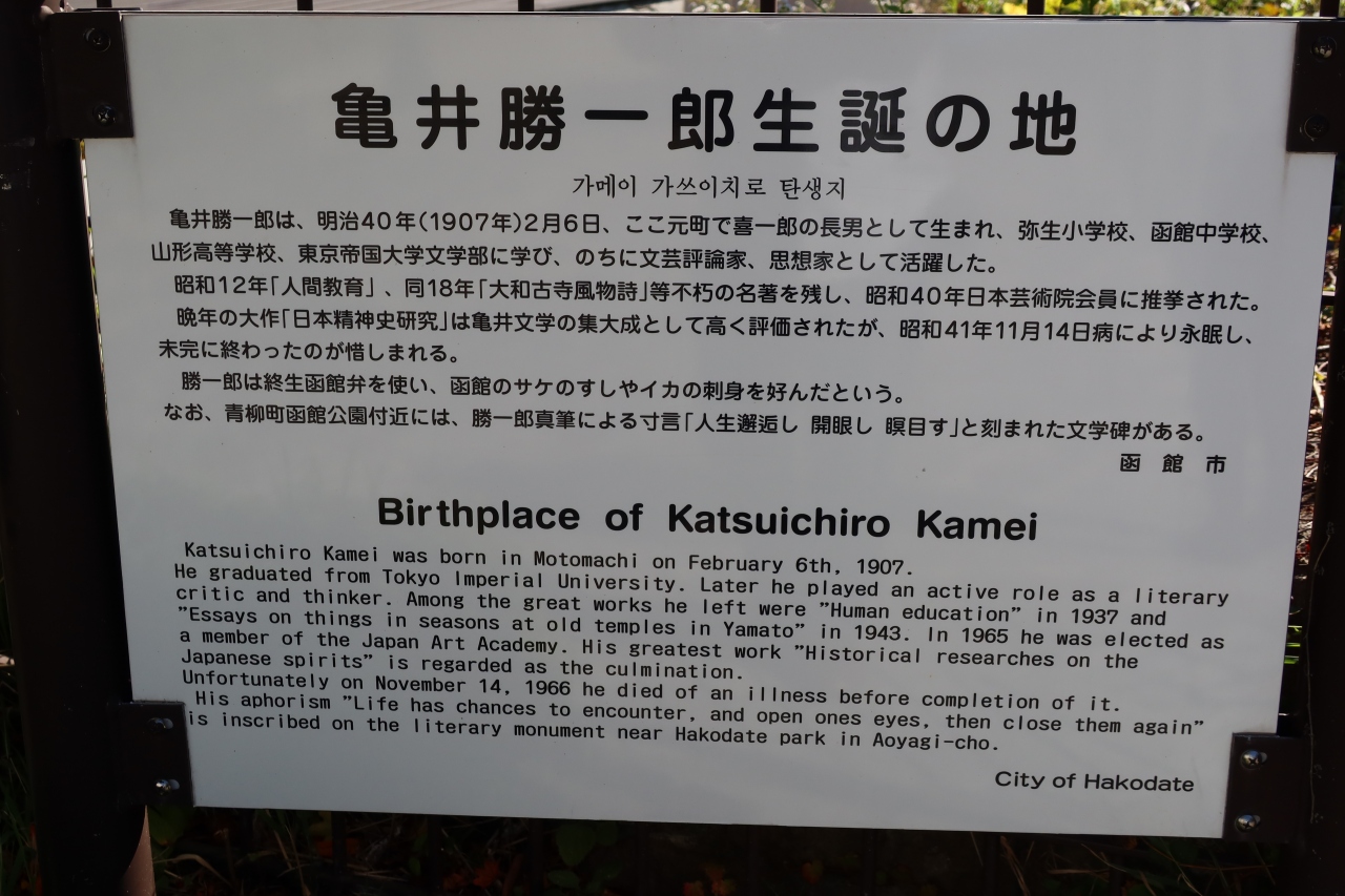 函館の大三坂にあるカトリック元町教会の対面大谷派別院の角に亀井勝一郎生誕の地碑が建てらています。文芸評論家、思想家として活躍して人物で、明治40年にこの地で生まれたことが刻まれています。ただの記念碑なのであまり見応えはありません。