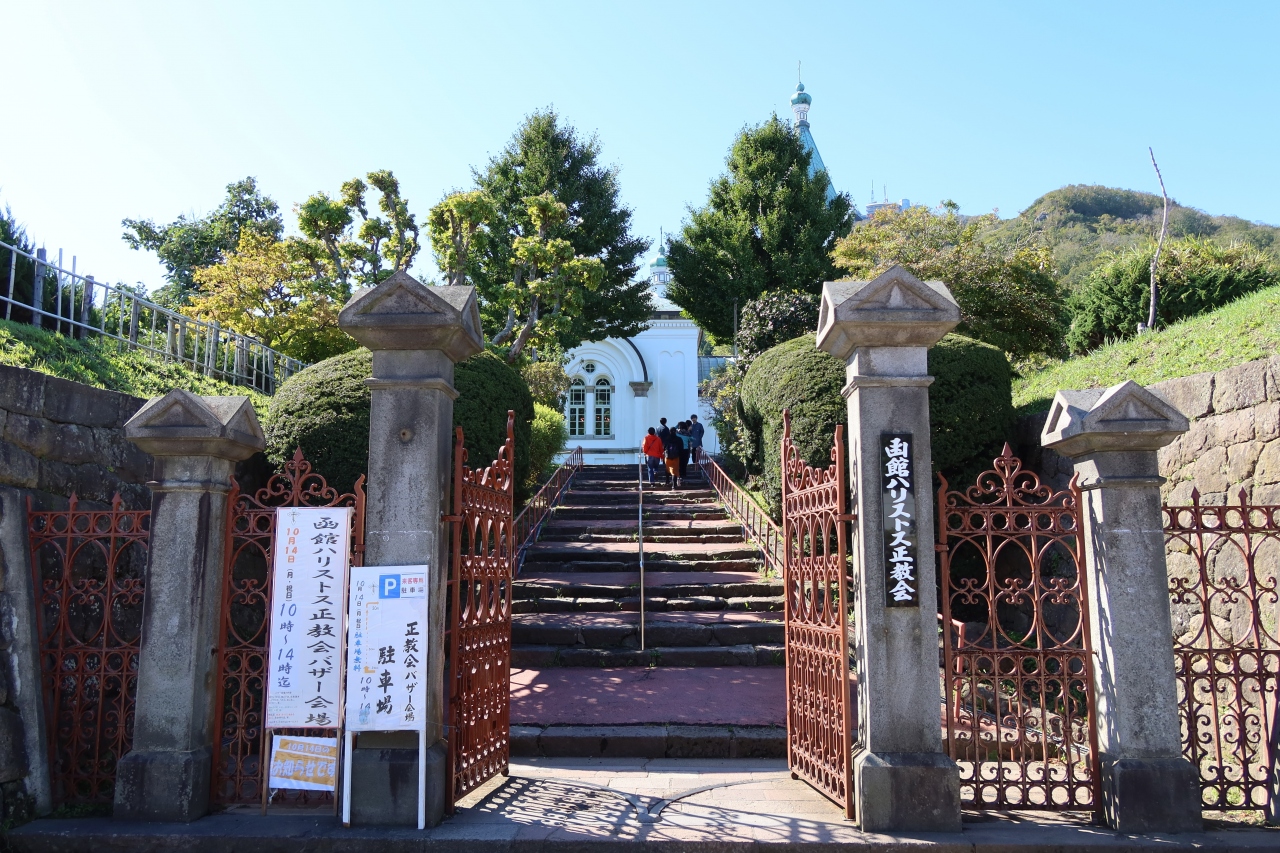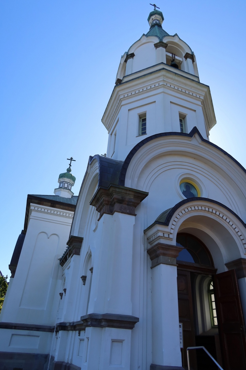 函館の大三坂を上り右手に行った所にある緑の屋根に白亜の壁の美しい教会が函館ハリストス正教会です。函館の観光ガイドやパンフレットの表紙写真になるほどの名所で澄み切った青空をバックにした教会はまるで海外にいる様な光景です。