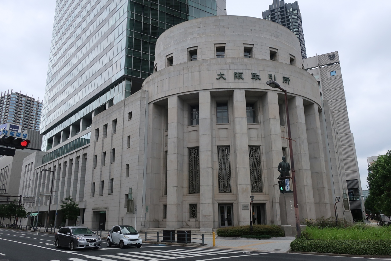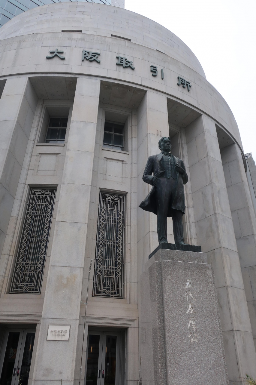 北浜にある大阪取引所の玄関口正面にそびえる銅像が五代友厚像です。NHKの朝ドラ「あさが来た」に出て来たことで知っている人も多いのではないでしょうか。薩摩出身で、明治11年に大阪証券取引所を設立し、大阪商工会議所の初代会頭を務め大阪経済を牽引したことで知られます。ただの銅像なので見応えは余りないですが、大阪経済の中心地である北浜、それも取引所の正面に立てられてほど、貢献したんだなぁと感心しました。