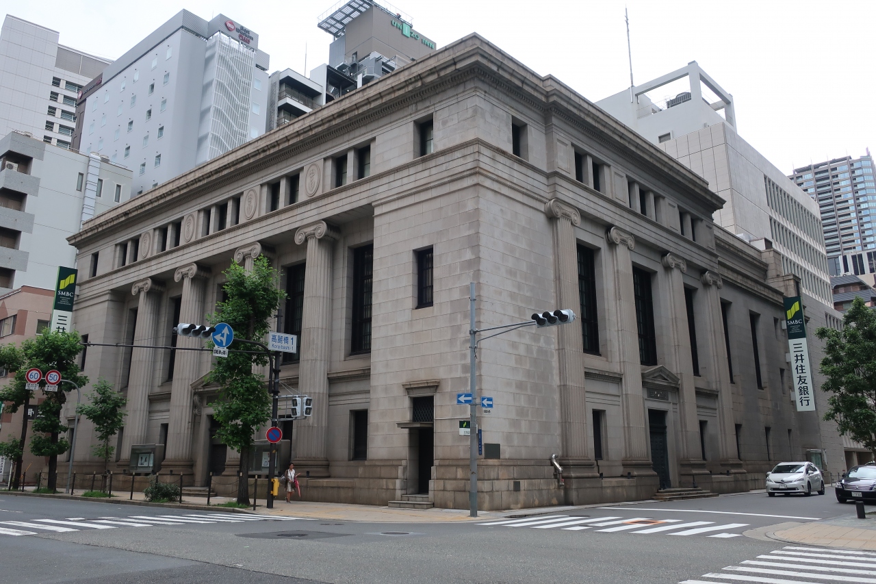 北浜から堺筋を下った高麗橋1丁目にある高麗橋野村ビルディングの正面にある銀行建築の建物が旧三井銀行大阪支店(三井住友銀行大阪中央支店)です。昭和11年に建てられた建物は御影石の列柱が並ぶギリシャ神殿風で、日本橋の三井本館を真似た様な造りをしており、いかにも銀行と言った佇まい。重厚感が堪りません。