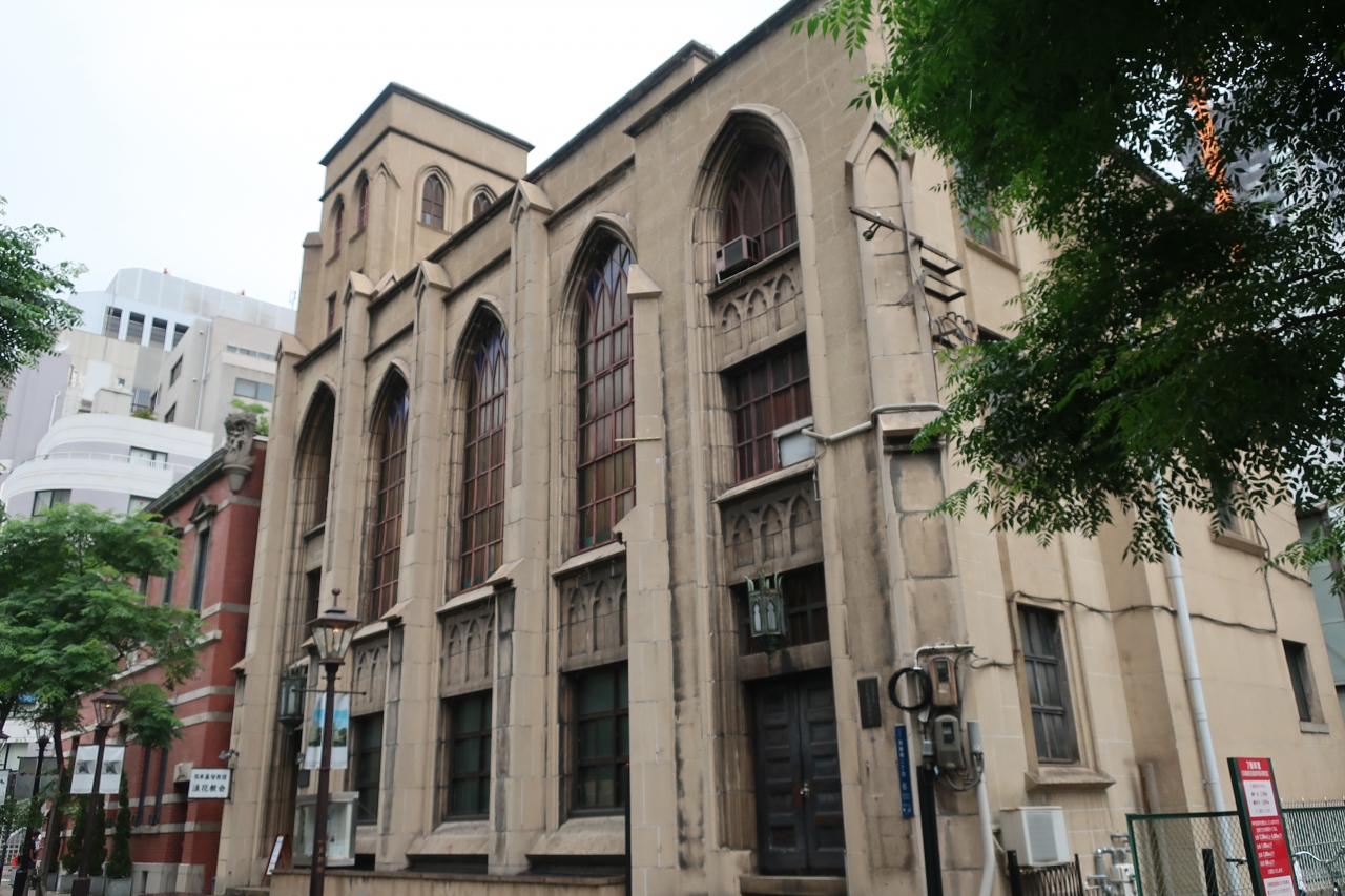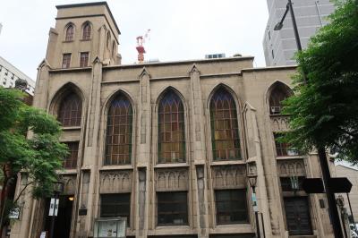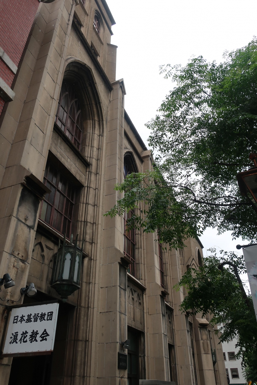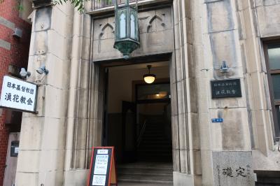 北浜のオフィスビル街の中、三休橋筋沿いに日本基督教団浪花教会があります。昭和5年に建てられた建物は、かのヴォーリズの設計指導によって建てられた教会で、ゴシック様式の尖塔窓、そこにはめられたステンドグラスの色ガラスが特徴的で見ごたえのあるレトロ教会です。訪れた日が日曜日で礼拝中であったため、中には入れませんでしたが、中から見たらさぞかし美しいだろうと思いました。