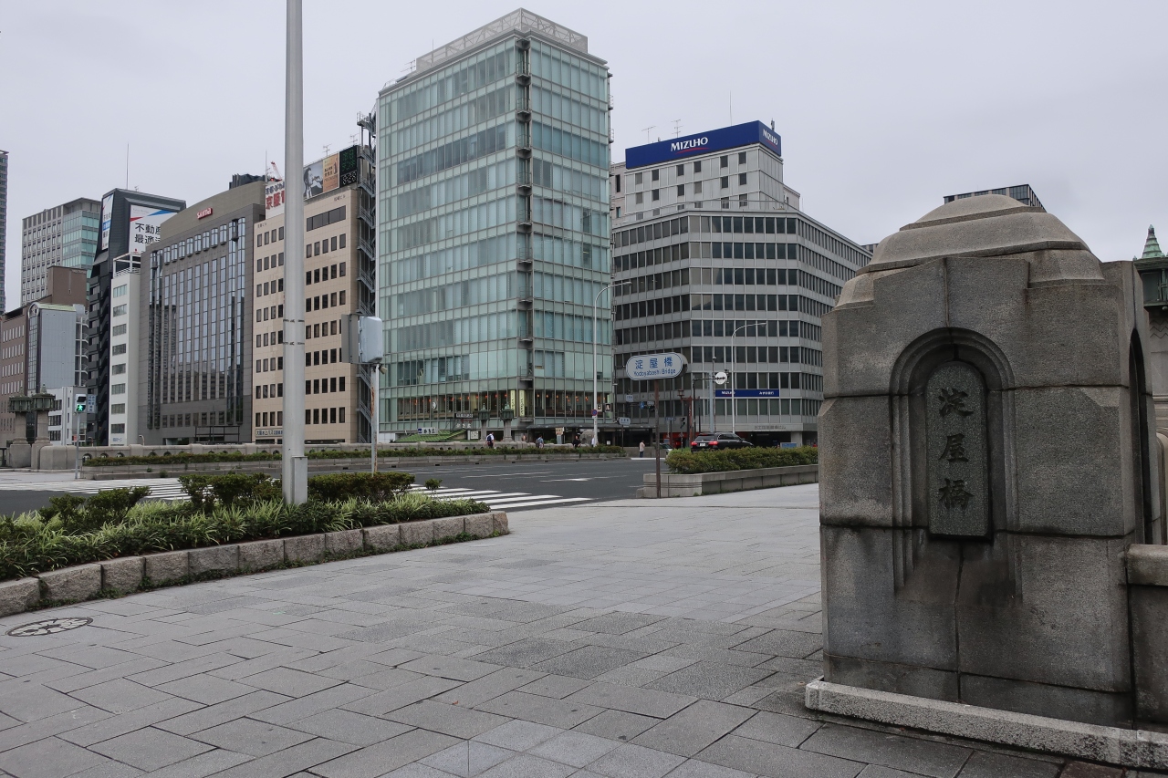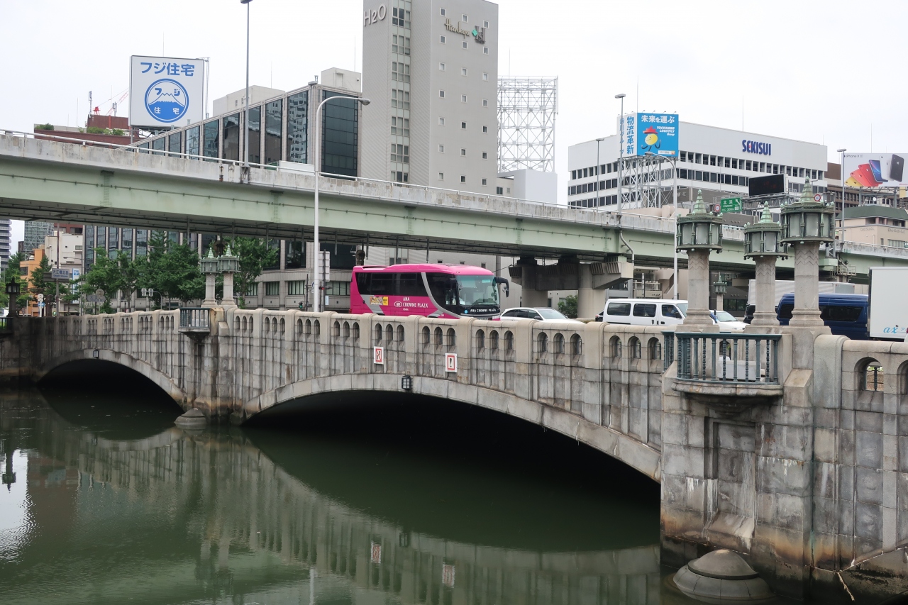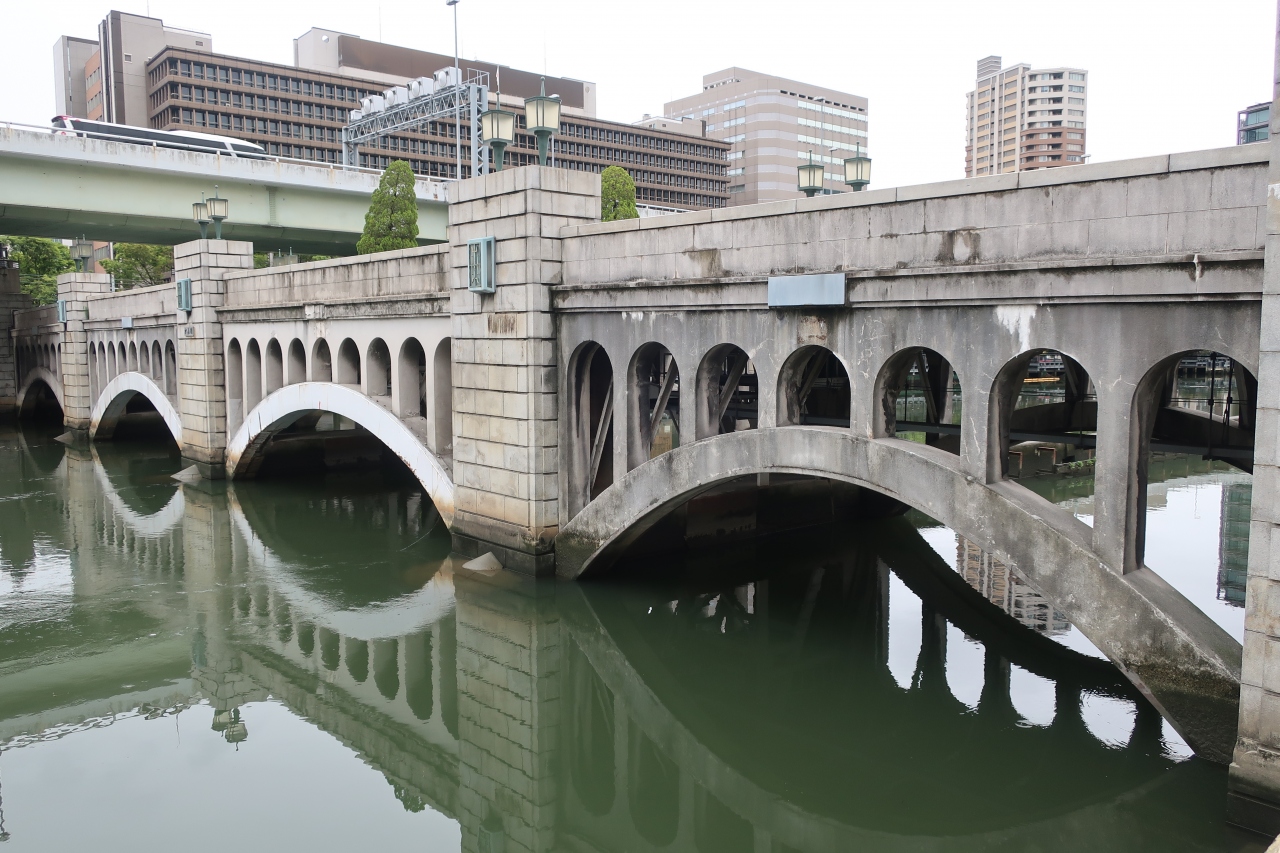 中之島の中心部、大阪市役所と日本銀行大阪支店との間、北側に架かる橋が大江橋です。堂島川五橋の一つに数えられる橋は元禄年間に架けられた物ですが、現在の橋は明治43年に架けられた鉄筋コンクリート造のアーチ橋。堂島川の川面に映る橋の姿がとても美しい橋です。