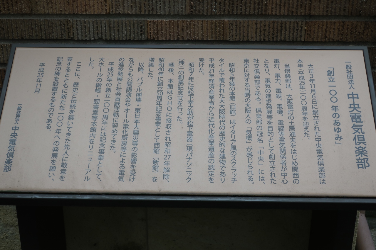堂島川に架かる渡辺橋の北詰めから一区画西に入ったところにある近代洋風建築が中央電気倶楽部です。昭和5年の建物はスクラッチスタイルの壁面、レリーフ、飾り壺が特徴的な建物で、今でも現役で使われています。大阪北浜周辺にはレトロな洋風建築が数多くありますが、その中でも見応えのある建築の一つです。レトロ建築好きには是非訪れて欲しい建物の一つです。