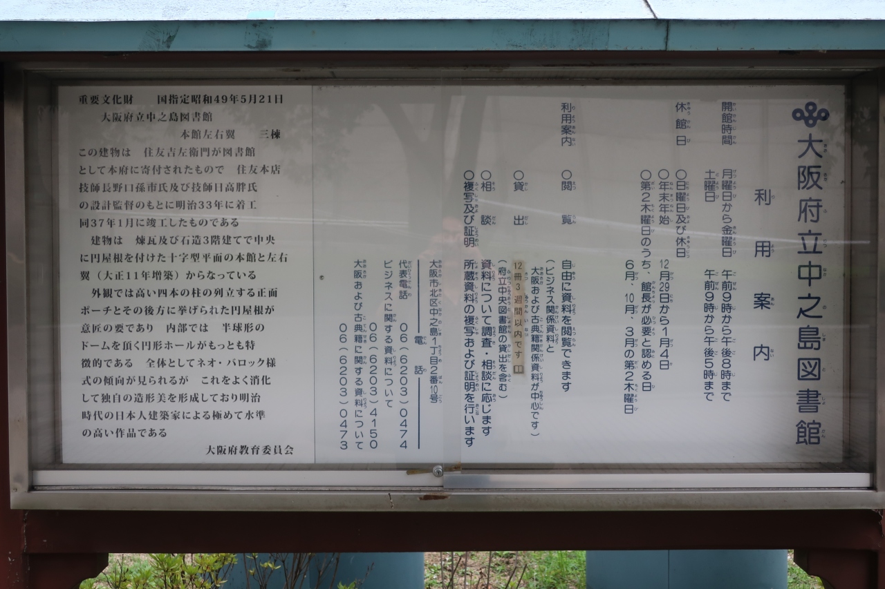 中之島の大阪市中央公会堂と大阪市役所の間に建つ建物が大阪府立中之島図書館です。石造りの建物はギリシャ神殿の様な重厚さで、とても立派な重要文化財に指定される建物です。明治37年に住友吉左衞門友純から寄贈され今でも現役で使われている図書館です。