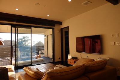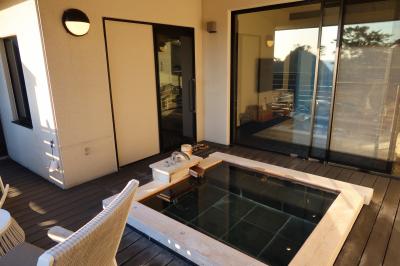 瑠璃の部屋は2ベッド、ソファーの洋室で。内風呂、源泉かけ流しの露天風呂げデッキにある贅沢な部屋です。温泉は無味無臭ですが、浸かるとポカポカになります。