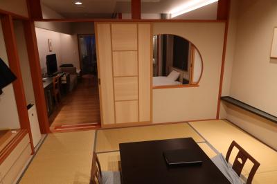 宿泊した部屋はは4階のスーペリア和洋室(411号室)。ツインベッドとファーを備えた洋室と8畳の和室、シャワールームとベランダテラスには陶器製の温泉浴槽を備えた部屋です。オーシャンビューの部屋で、温泉に浸かりながら、弓ヶ浜の先に美保の半島が一望でき贅沢な時間を過ごせました。
