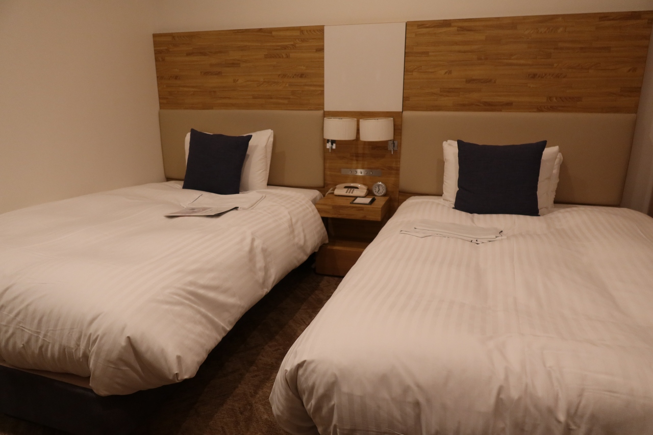 宿泊した部屋は別館 生駒の山のツインの部屋。眺望は隣の棟しか見えませんが、本館の部屋よりも新しく綺麗でした。また、靴を脱いでくつろげるのも良いです。