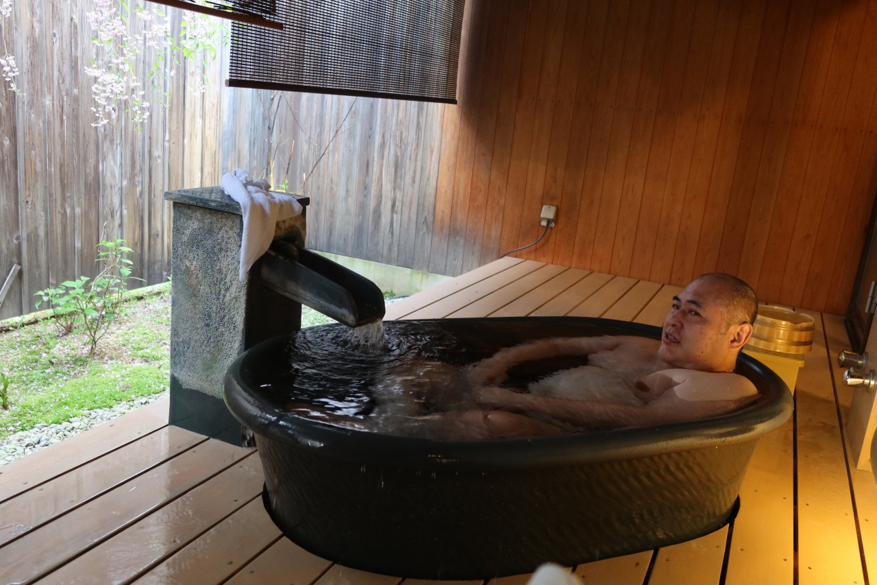 宿泊した部屋は露天風呂付き客室の別邸 桜桃庵の和洋室。部屋の前にデッキがあり、板で正面が覆われており景色は良くありませんが、GWにも関わらず、前庭に植えられたしだれ桜には桜の花が未だ残っており、それをみながら温泉に浸かることができ、とても満足。