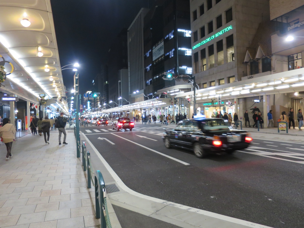 京都で一番の繁華街がこの東大路から烏丸までの四条通り沿いです。通り沿いには高島屋と大丸等の百貨店。鍵善良房、福寿園等の老舗店。そして数多くある土産店があり、新旧入れ混じった賑やかな通りで色々な店を見て歩くのがとても楽しい通りです。