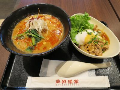人気NO.1セットの「担々麺・ハーフ牛肉ごはん温泉玉子のせ」を頂きました。坦々麺は胡麻味が強く、しっかりとした味で、汁を飲み干す程の美味なのに対し、牛肉ご飯は甘辛い味付けで今一。量は充分でしたが坦々麺だけで良かったなと。