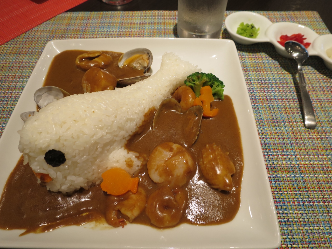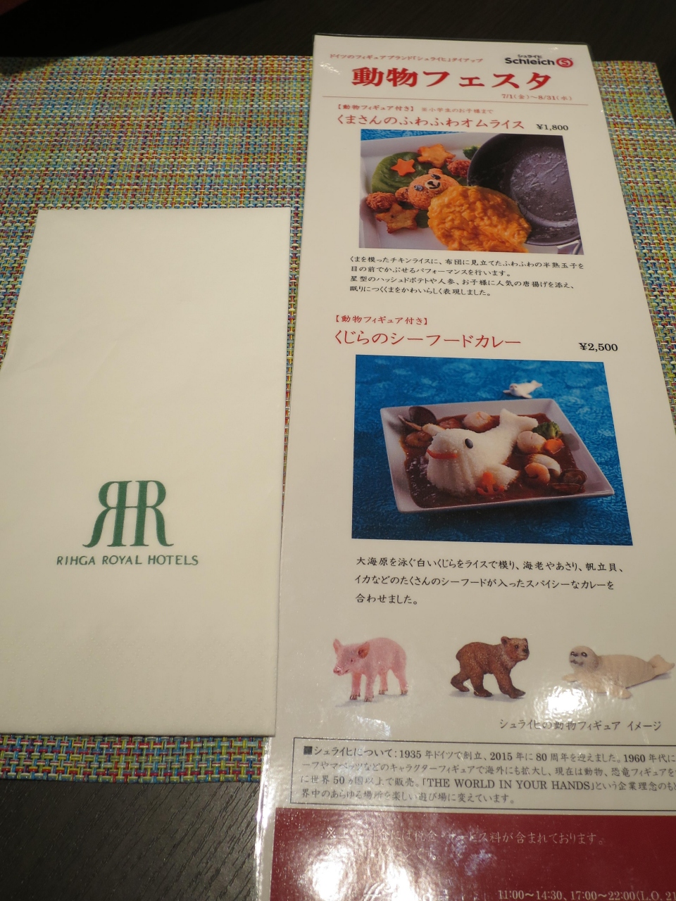 早稲田にあるリーガロイヤルホテル東京のダイニングです。こちらの店はランチビュッフェが人気ですが、今回はCMで見た「くまさんのふわふわオムライス」を食べてみたく動物フェスタのメニューを頂きました。ドイツのフィギュアメーカーのシュライヒとタイアップした企画で、先のメニューの他、「くじらのシーフードカレー」があります。見た目を楽しむ料理ですが、なかなか味も良いのですが、量が物足りないのが欠点。
