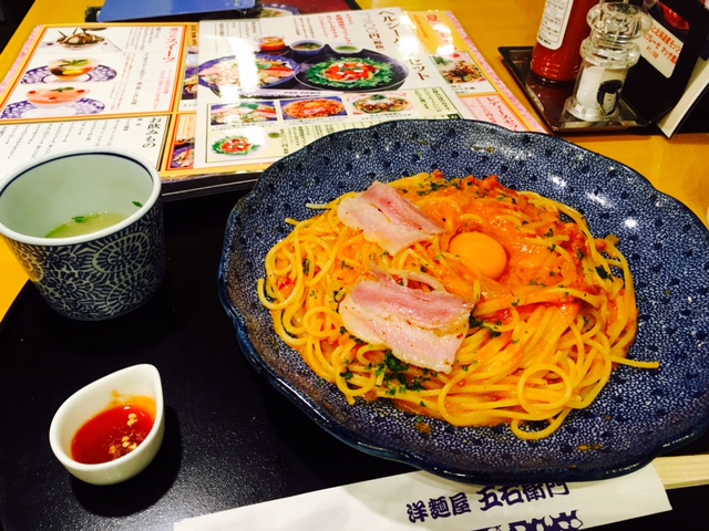 平日の夜8時過ぎに入りました。頼んだメニューは夏のトマトカルボナーラ 島唐辛子付。季節メニューで変わっているなと思って頼んだのですが、至って普通でした。