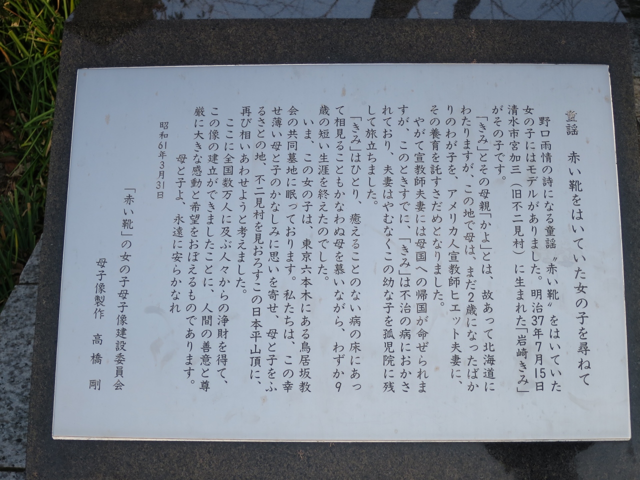 野口雨情の童謡「赤い靴」モデル、きみちゃんの像が日本平の山頂付近にもありました。横浜の山下公園、横浜駅自由通路、麻布十番商店街で見ましたが、そう言えばきみちゃんは日本平出身でした。他の像と異なるのは母子の像であること。なぜそんなに多くの像が立てられるほど人気があるのか良くわかりません。