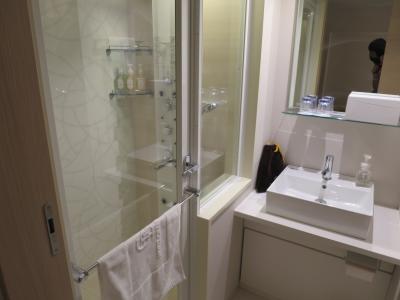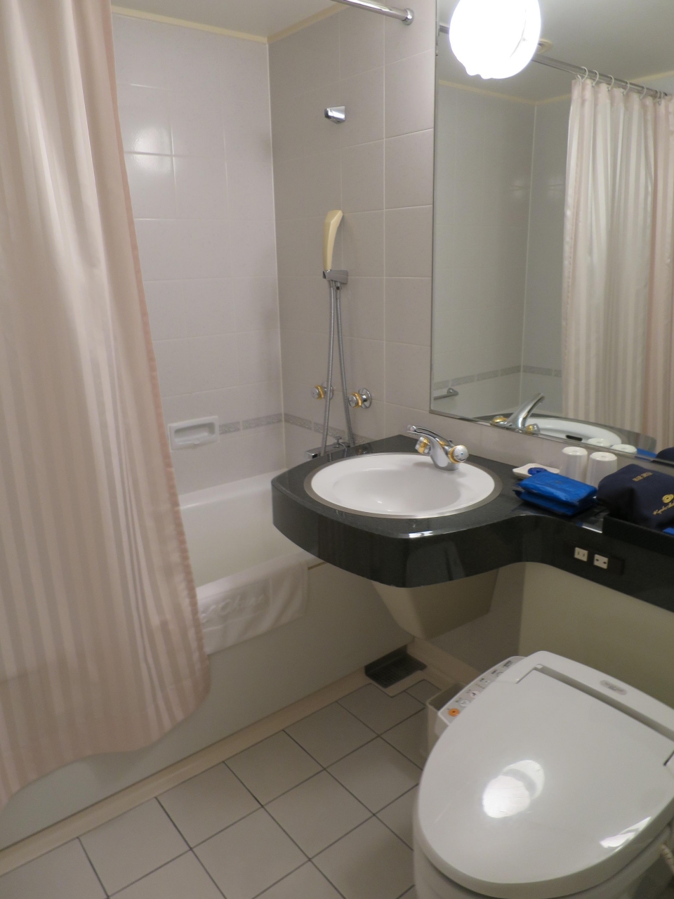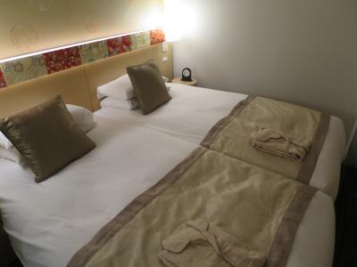 泊まった部屋は9Fのツインルーム。部屋は広くなくシングルベッドが引っ付いて設置されており、キングサイズのダブルベッドの様でした。部屋にはバスルームはなく、シャワールームだけ。大浴場が別にあります。シャワーは最新で、ヘッドシャワー、ボディーシャワー、ハンドシャワーと3つのシャワーがあり、とても快適です。