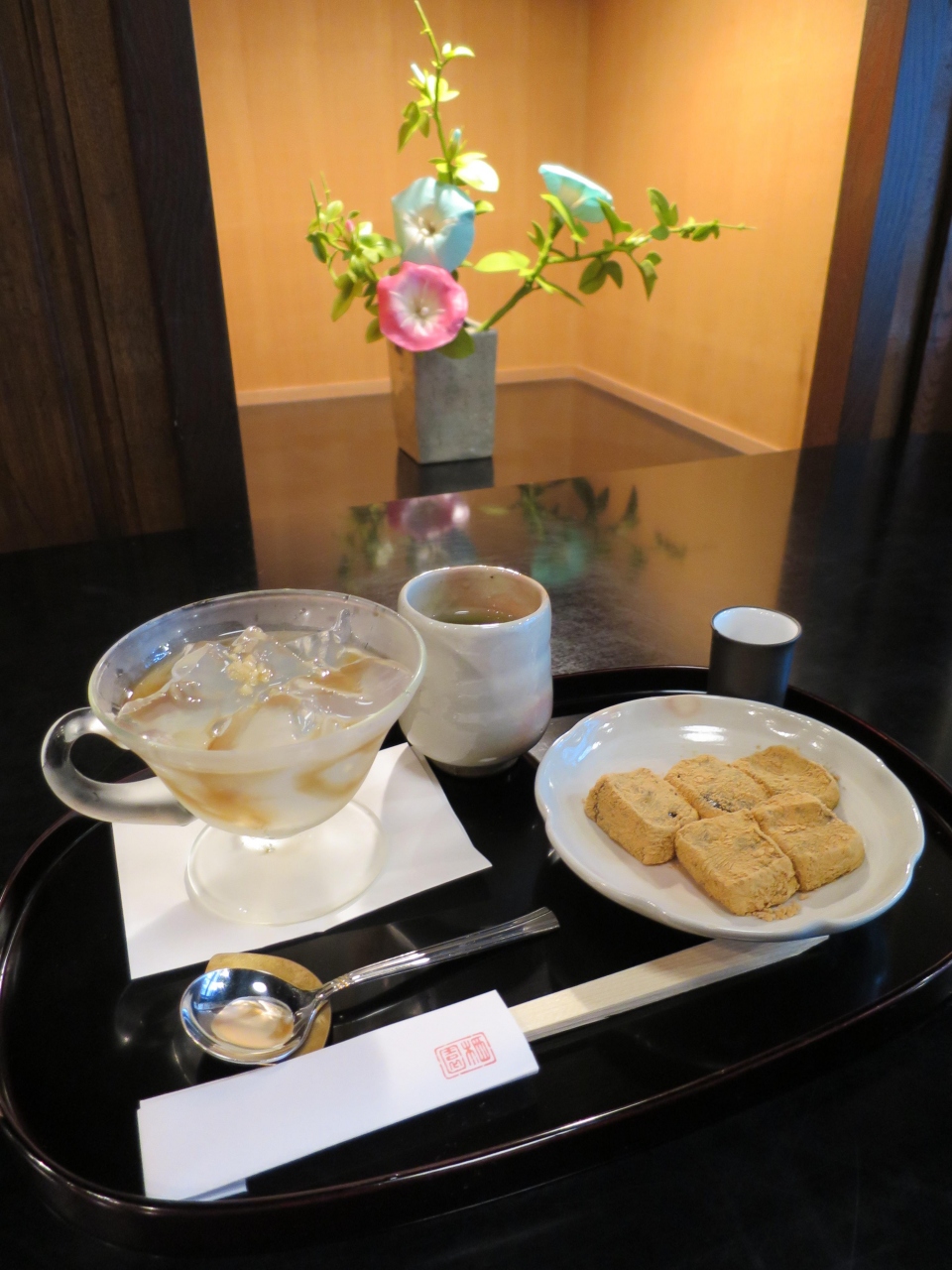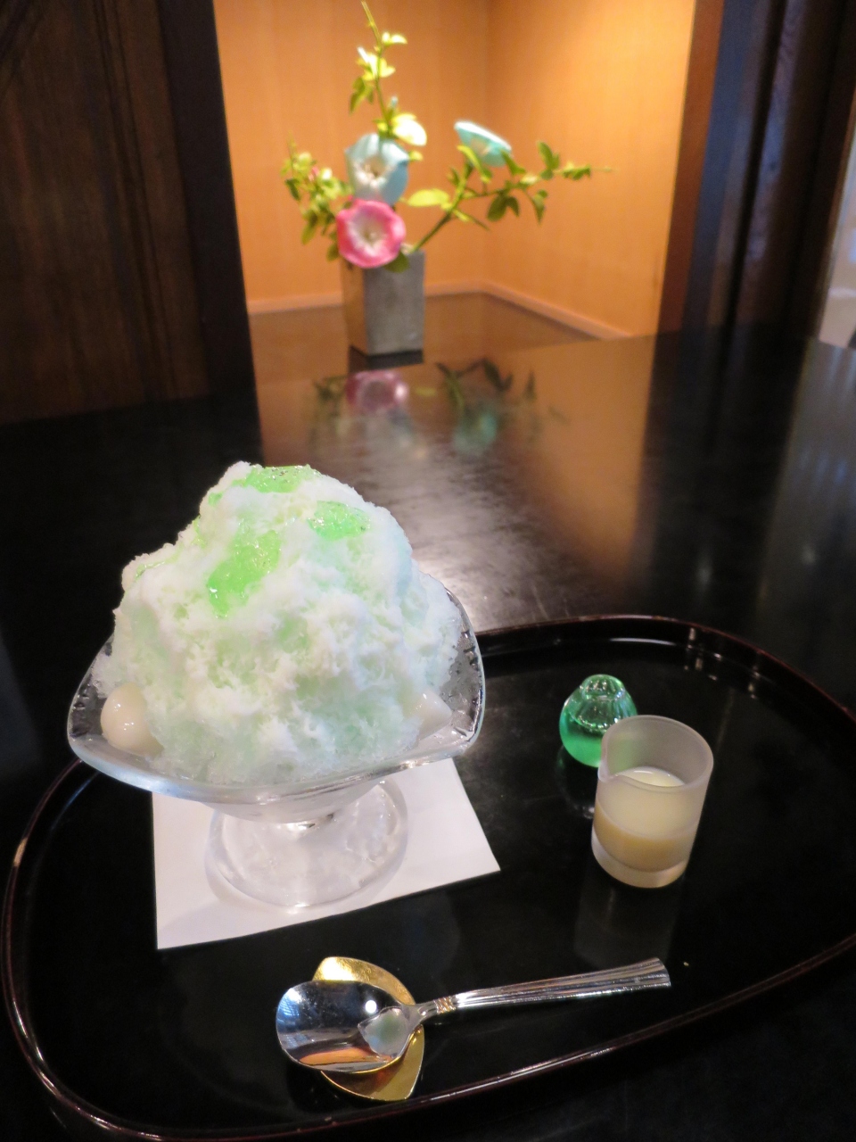名物の琥珀流し、わらび餅セットとミント味のかき氷を戴きました。8月の琥珀流しは生姜味風味でつるつると喉の奥へ。かき氷はなめらかで、そんなに冷たく感じませんでした。