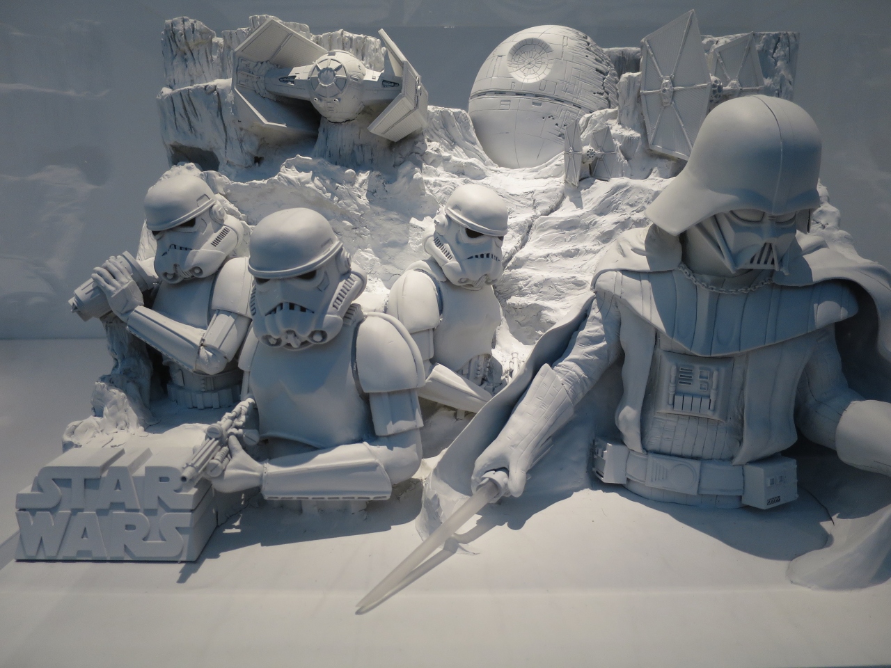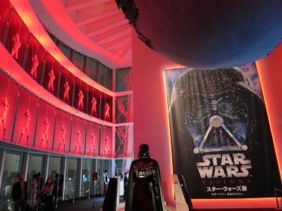 52Fに上ると、NARUTO展と並んで入口があり、入るとすぐにデス・スターとダース・ベーダーのお出迎え。展示物の写真撮影ができるのはここまで。中も結構余裕を持って見学できました。グッズはボールペン等手頃な物は売り切ればかりでした。