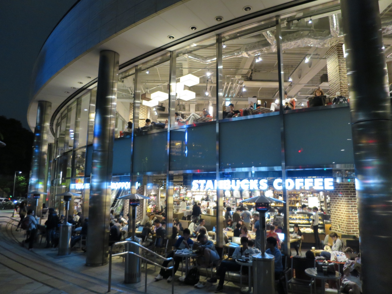 六本木のけやき坂を下った交差点の右手にあるTSUTAYAとコラボレートしたスターバックスのお店です。この形態の店舗は代官山店をはじめ都内には7店あるそうです。