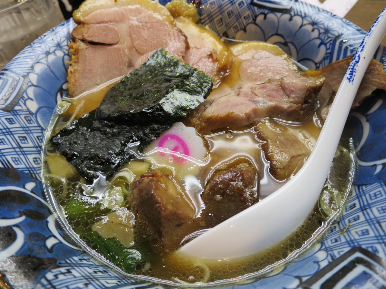 店内はカウンター席のみ12席位でしょうか。座席はほぼ満席。肉盛りそば、ワンタン麺と餃子を頼みました。一人で切り盛りしているので(以前は二人だったが)時間が掛かります。