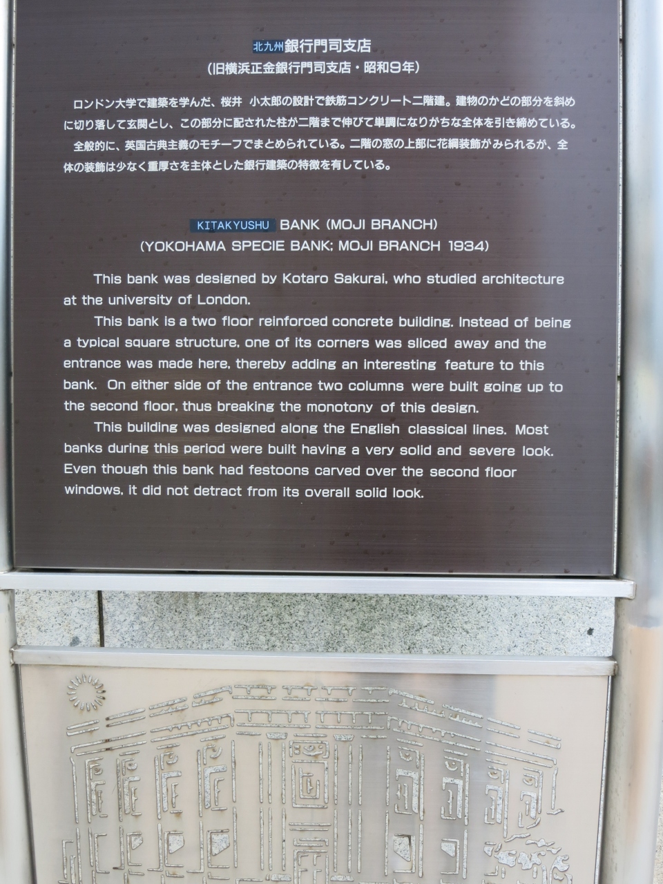 昭和9年に桜井小太郎の設計で建てられた鉄筋コンクリート製2階建。重厚な近代様式の銀行建築は門司ではここだけでじゃないでしょうか?外からでも見ごたえのある建物です。- 旅行時期