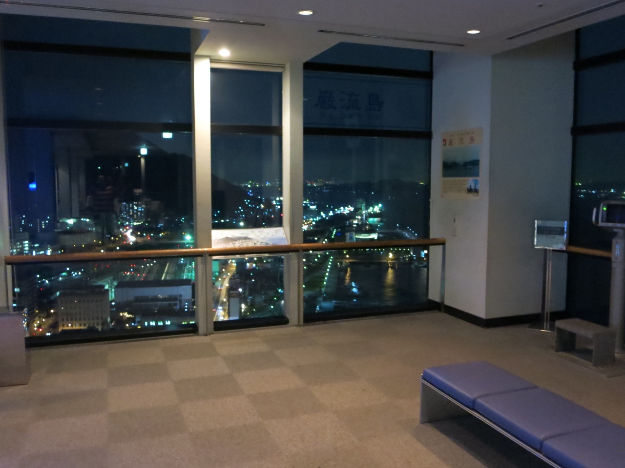 世界的建築家の黒川紀章氏が設計した高層マンション 門司港レトロハイマートの最上階が門司港レトロ展望室になっています。日中に上るか、日没後に上るか迷い、結局夕暮れ後の時間に上りました。この時間だと門司港レトロ地区のイルミネーションも見えますし、関門峡などの遠景も望めるので一番ベストな時間帯だと思います。