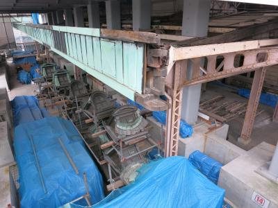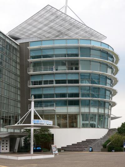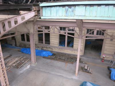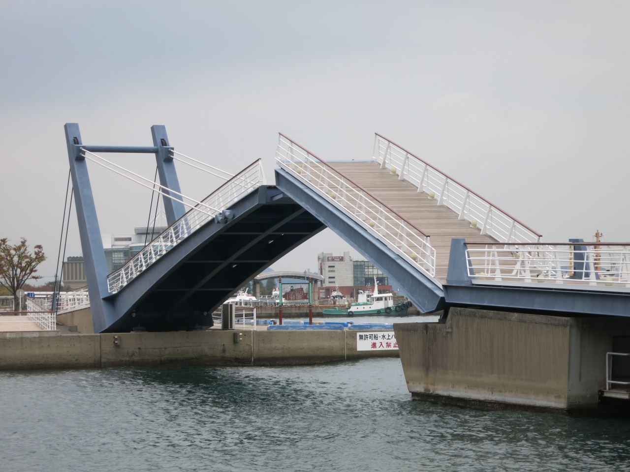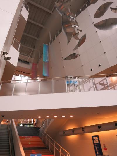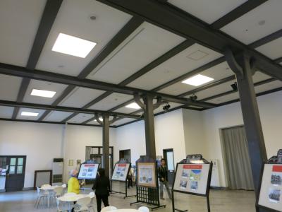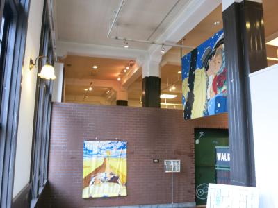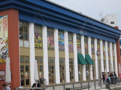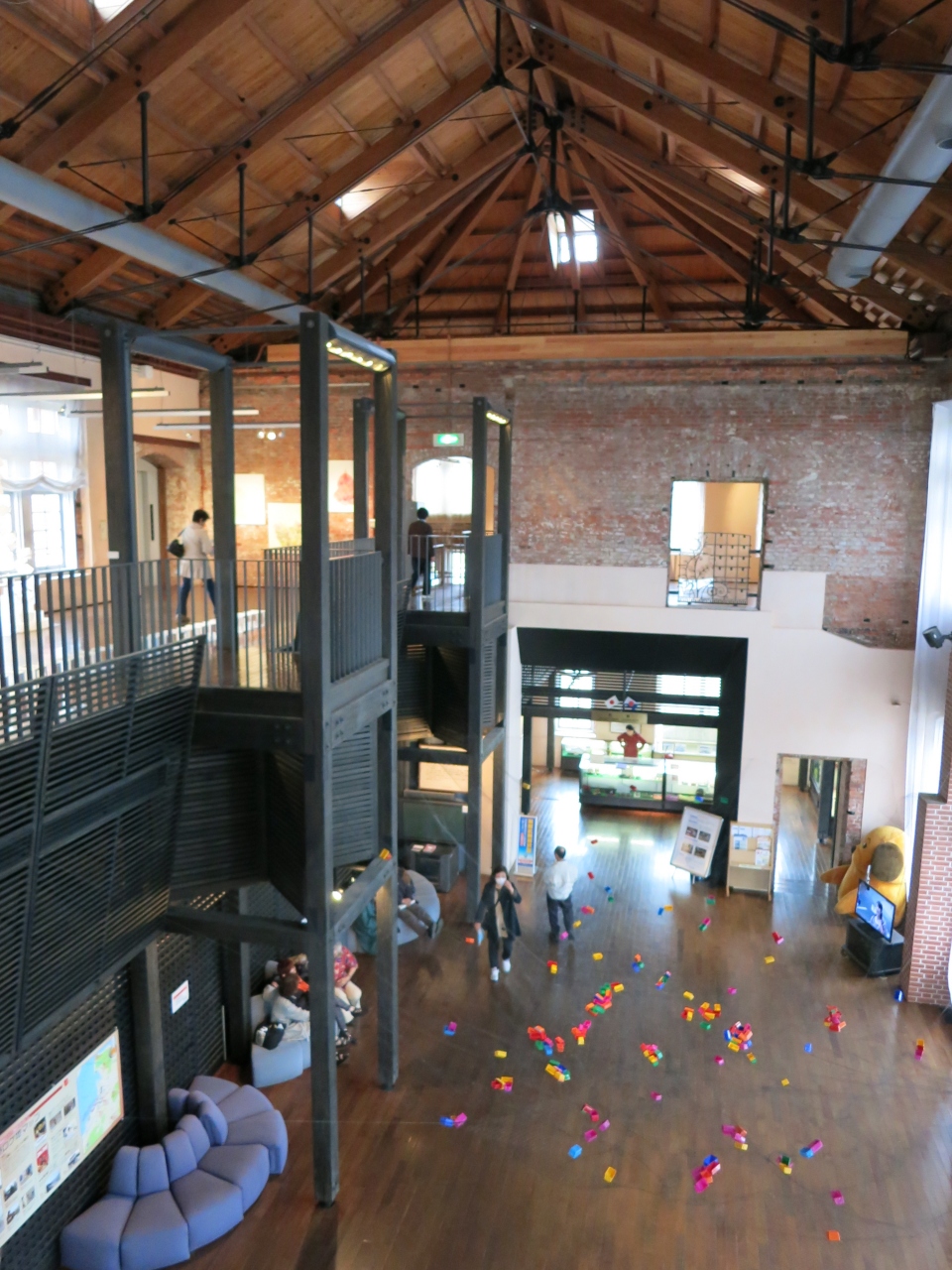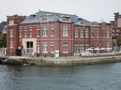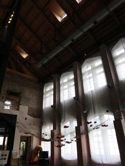 中に入ると内部は大きな吹き抜けになっていて、天井の梁まで見渡せませす。この吹き抜けではアート作品が展示?されていました。1Fは税関のPRコーナーと休憩用の椅子があり、港に面した一角にはレトロ喫茶があり、そこで一服しました。2Fはギャラリーになっていて、さらに3Fに上れるところがあり、ここから窓越しに見渡せます。