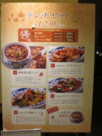 東急百貨店たまプラーザ店の5階レストラン街にある中華料理店。四川省成都の陳という顔にあばた(麻子)があるお婆さんが作った豆腐料理が麻婆豆腐。その正統な味を楽しめると言うことで、ランチを食べに行きました。
