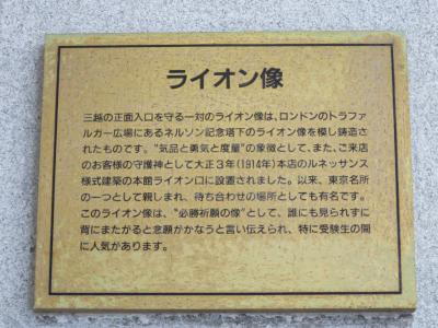 三越日本橋本店の入口の両サイドに2基のライオン像が設置されています。百貨店がオープンした1914年に英国のトラファルガー広場にあるライオン像を模して作られた物で、三越のシンボルとなっています。他の店舗にもライオン像がありますが、これが本物。