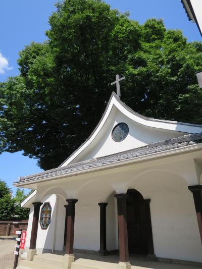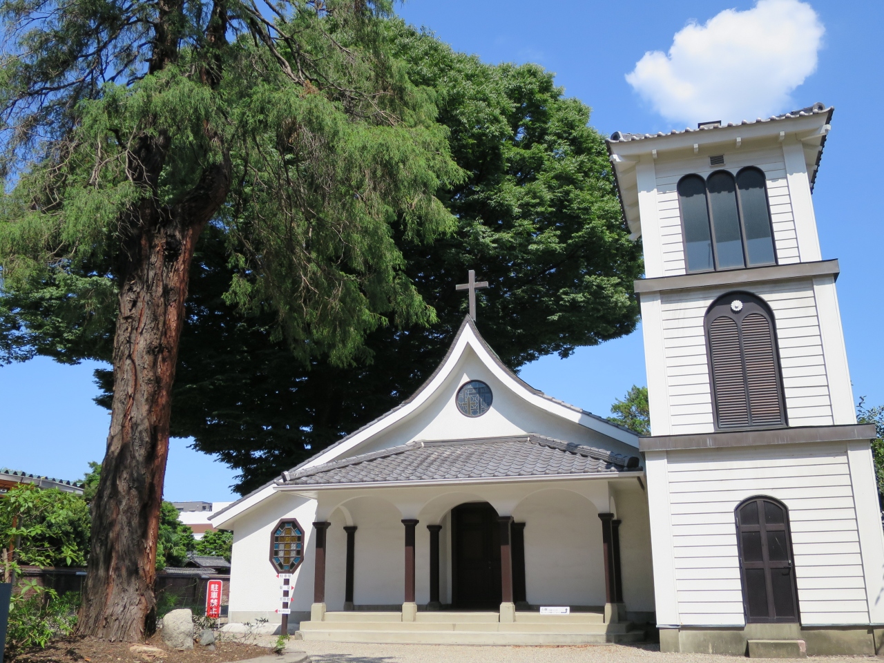 名古屋の白壁・主税・橦木町並み保存地区の大通り沿いにあるカトリック教会です。明治37年に建てられた白い教会は、木造瓦ぶきの和風な教会で、カトリックを東海地方に広めた井上秀斎、テュルパン神父が建てた物です。