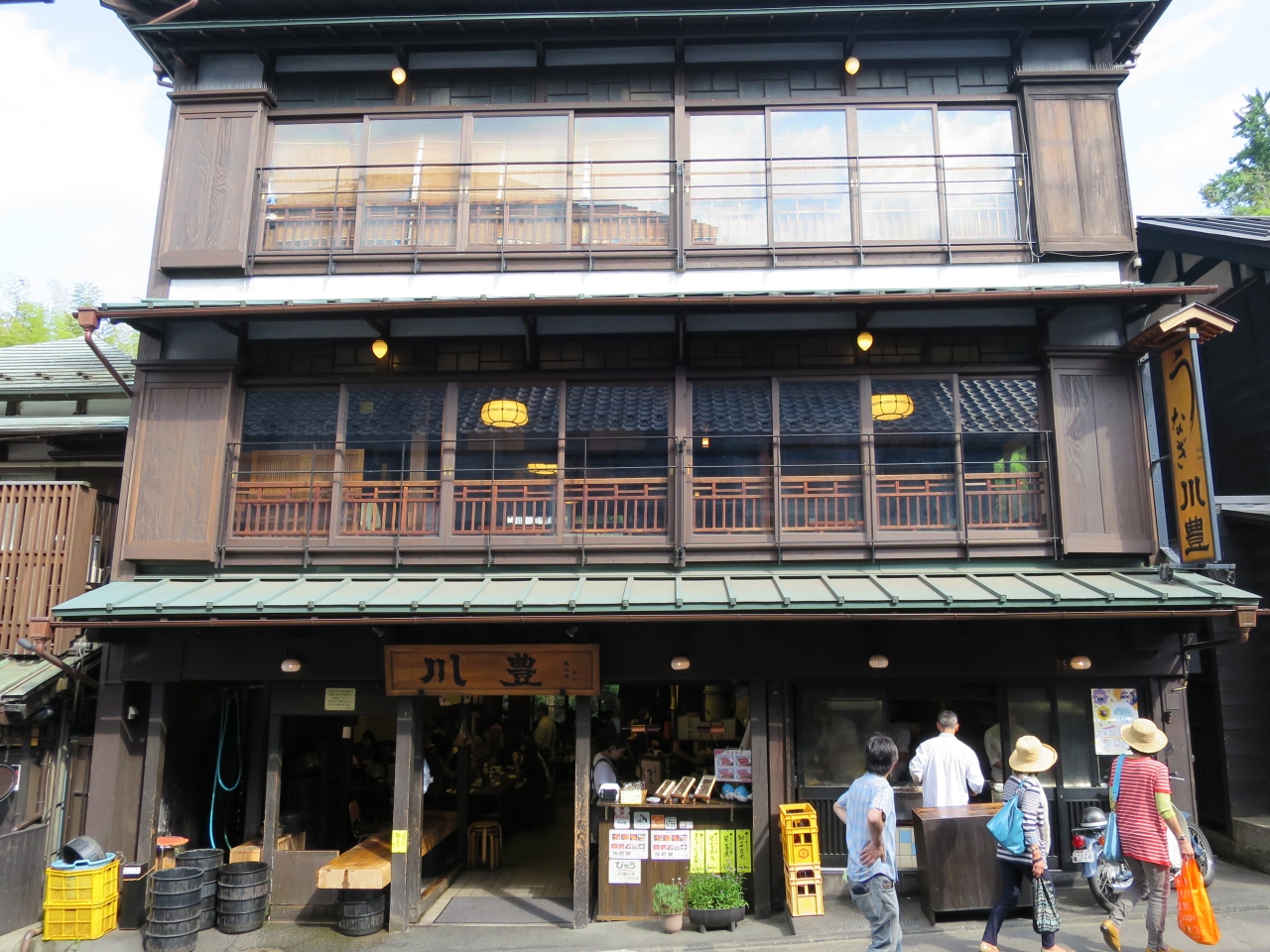 成田山新勝寺参道の中腹にある木造3階建ての鰻の名店です。週末の土曜日だったので、絶対に混んでいると思い、わざと時間をずらして15時頃に川豊 本店に行きました。思った通り、すんなり1階席に入れました。(ちなみに、支店に方はお昼は15時までです。)外人客も沢山来られており、一番人気の鰻店ではないでしょうか?