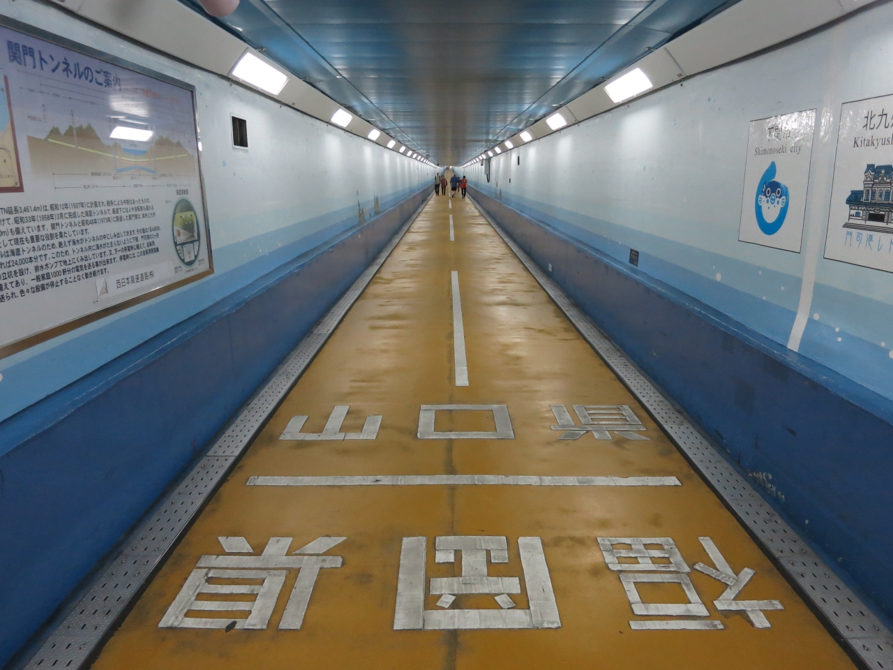 めかり観潮遊歩道を歩いて行くと関門トンネル人道に行けます。大きなバイクも乗れるエレベータが2基あり、30秒程乗り降りると関門トンネル人道トンネルの門司側のホールに着きます。ここから一直線に続くトンネルが下関まで続きます。中間点の山口県と福岡県の県境まではゆっくり歩いて10分程度でしょうか?県境には線が引かれいます。