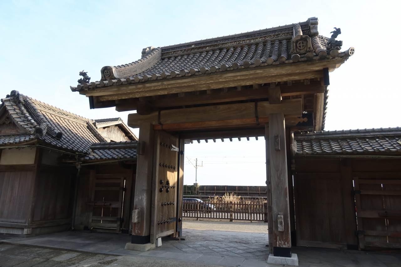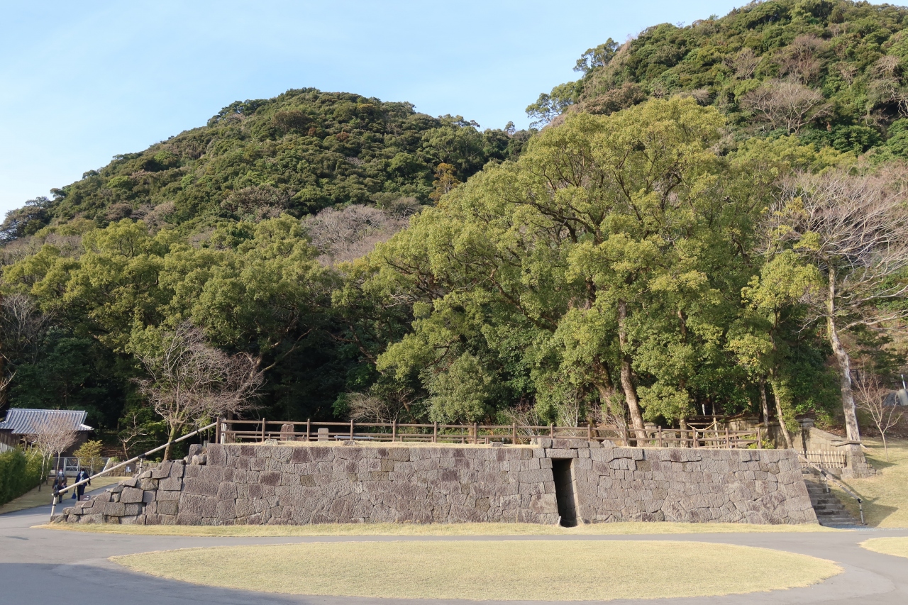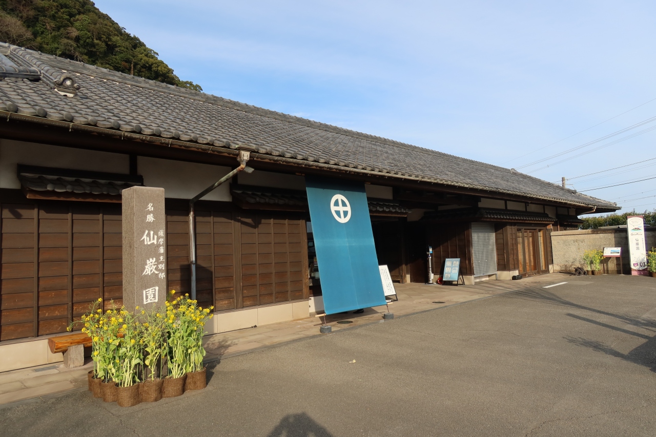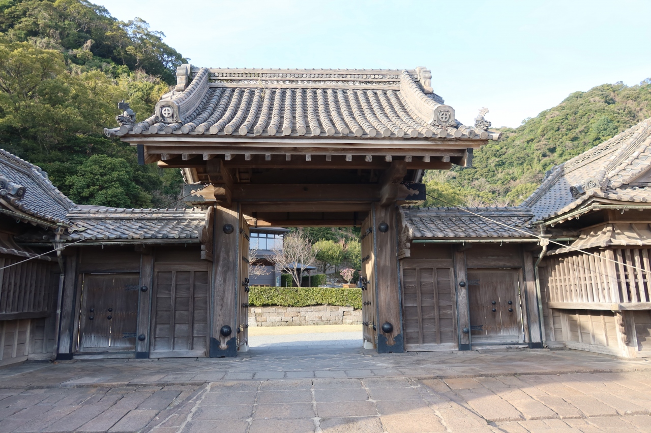 仙巌園の正面入口から土産処を過ぎた先の、国道に面した所に仙巌園正門があります。明治28年に建てられた門で江戸時代のものではありません。瓦や、上部には丸十の島津の家紋が施され、殿様の別邸らしい風格のある門です。