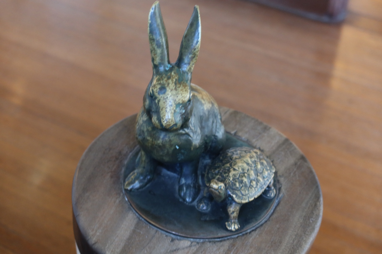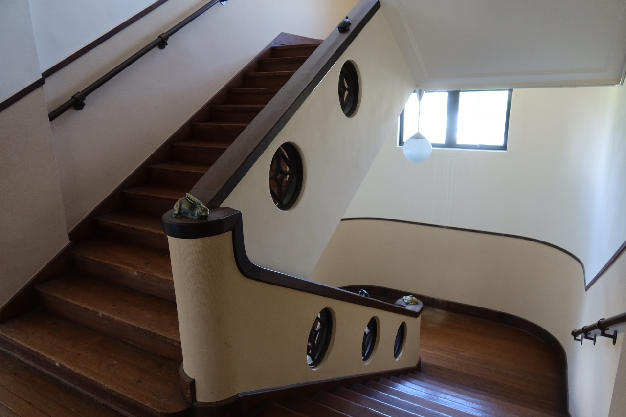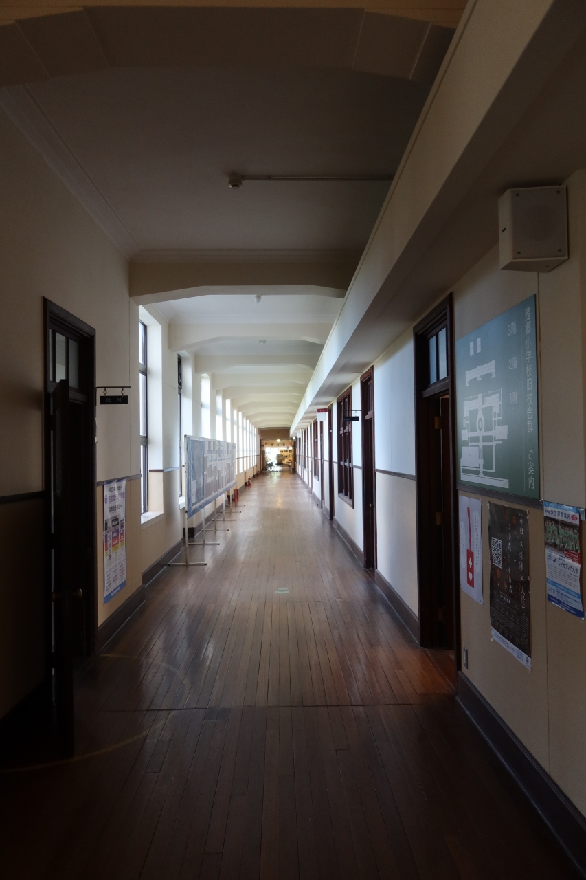 豊郷駅の北方、旧中山道に面した所に豊郷小学校旧校舎群があります。昭和12年にウィリアム・メレル・ヴォーリズの設計によって建てられた鉄筋コンクリート造の校舎です。左右対称の校舎に入るとどこかで見たことがある様な懐かし感じの教室、廊下があります。中央の階段の手すりには兎と亀をモチーフにした像の装飾があり遊び心を感じます。