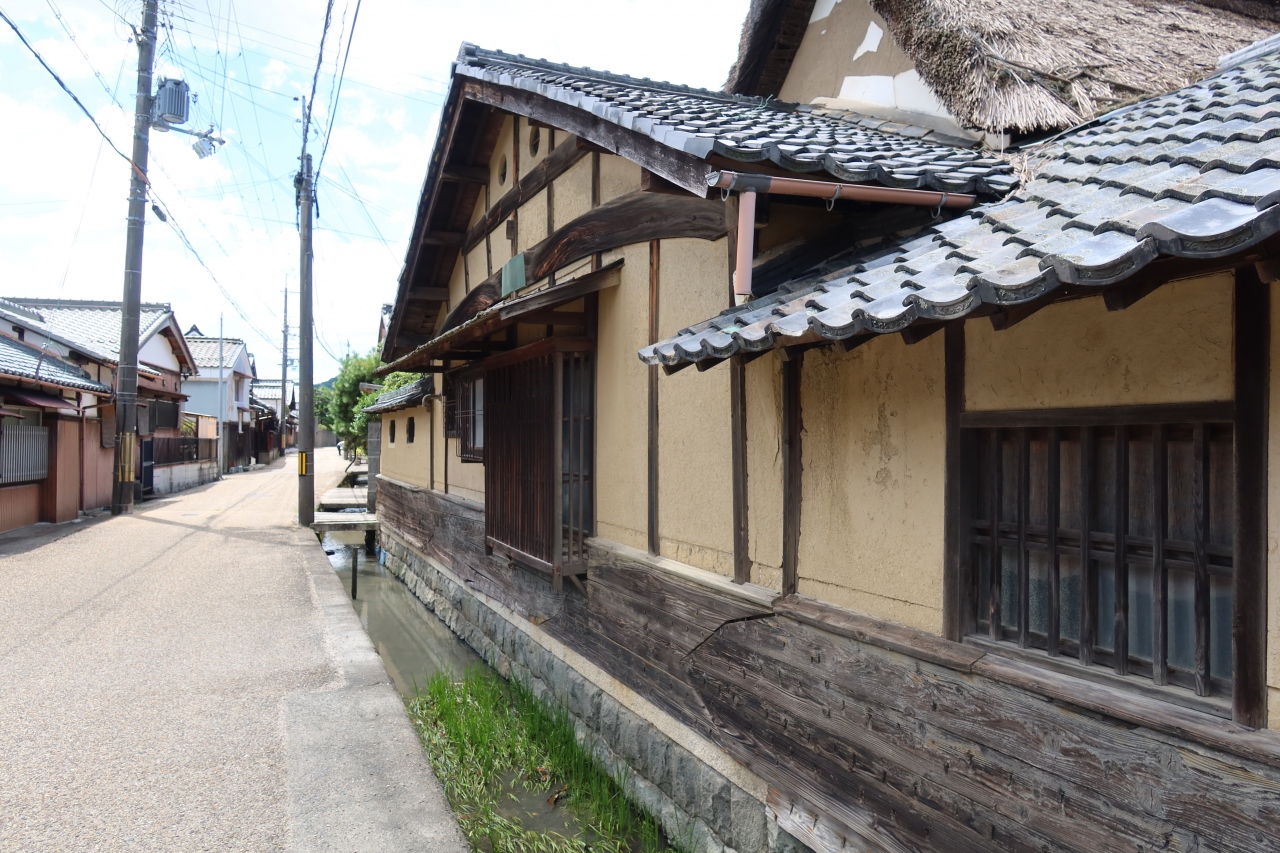 五箇荘の金堂地区にある弘誓寺、五個荘近江商人屋敷外村繁邸、五個荘近江商人屋外村宇兵衛邸の前を通る通りが寺前・鯉通りです。通りには錦鯉が泳ぐ用水路が流れ五箇荘で一番趣きのある通りです。車で通る場合、幅員が狭く脱輪することもあり得るので注意が必要です。