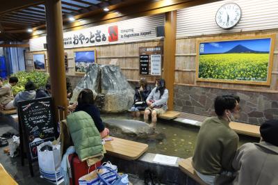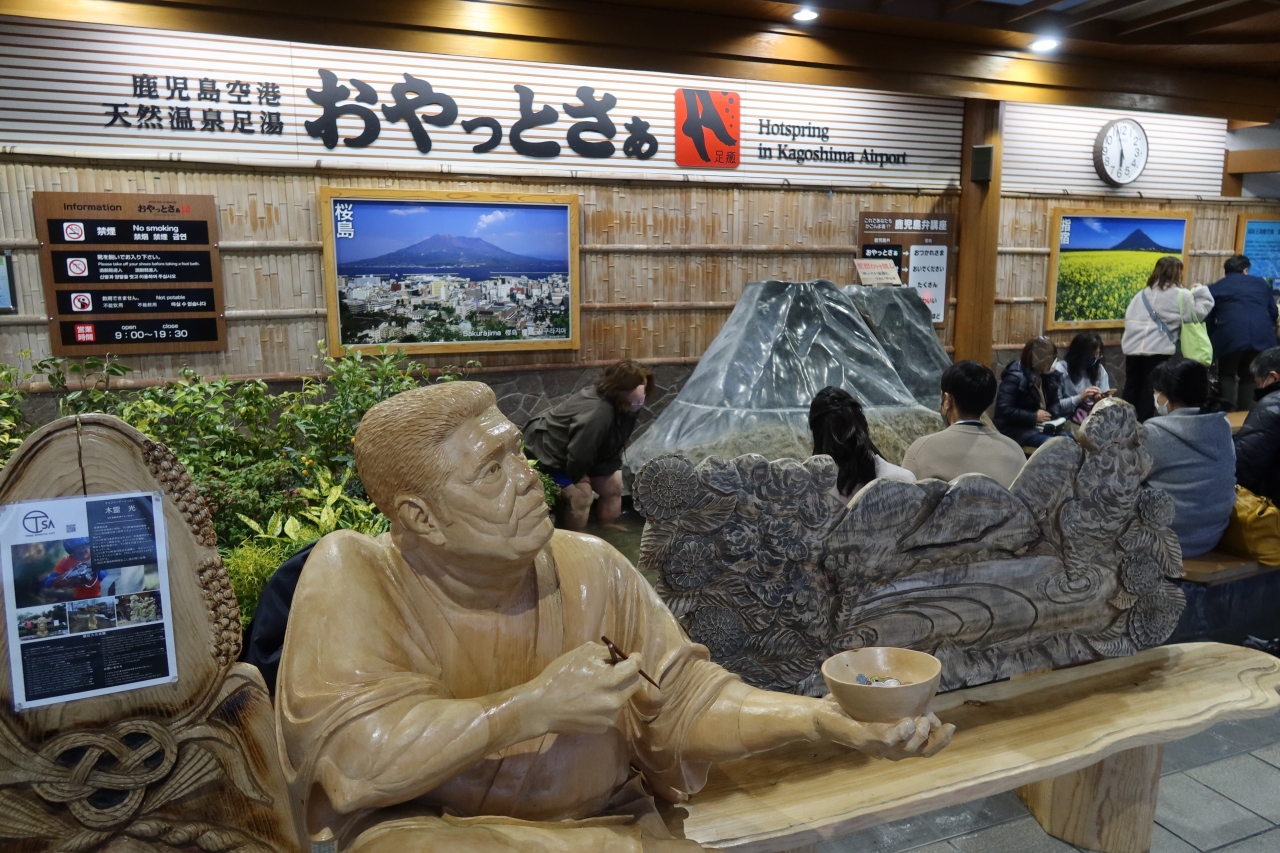 鹿児島空港の国内線乗場の1階出入口②と③の間にある足湯温泉が「おやっとさぁ」です。鹿児島観光からの帰りの飛行機の搭乗前に時間があったので、鹿児島最後の温泉に浸かりました。上諏訪駅などでホームに温泉がある所は幾つか入ったことがありましたが、飛行場では見たことがありませんでした。西郷さんの像や桜島のオブジェもあり、鹿児島最後の記念になりました。
