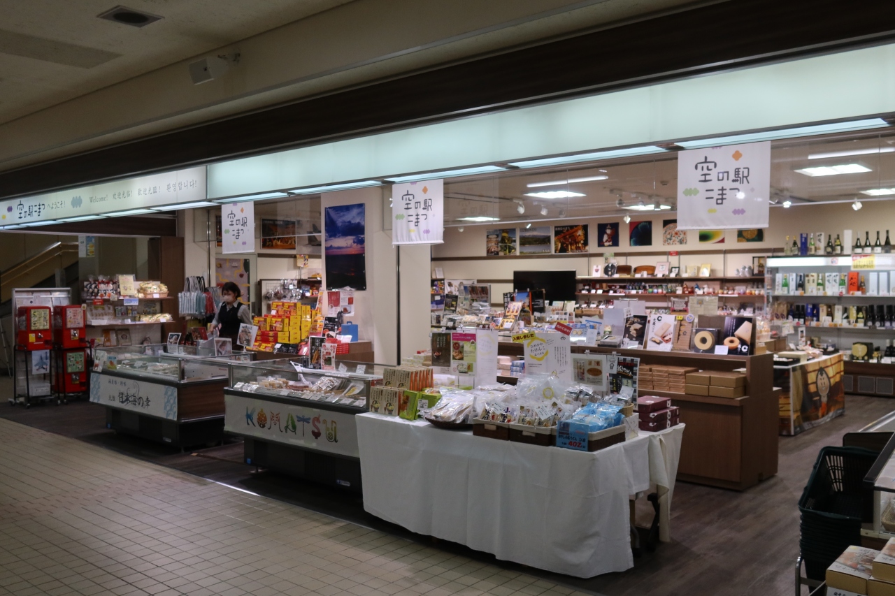 小松空港国内線の1階到着口のそばにあるオレンジ色の看板の土産物売店がこまQショップ1F売店です。こちらでは石川県を始めとした北陸地方の特産品土産を買うことができます。