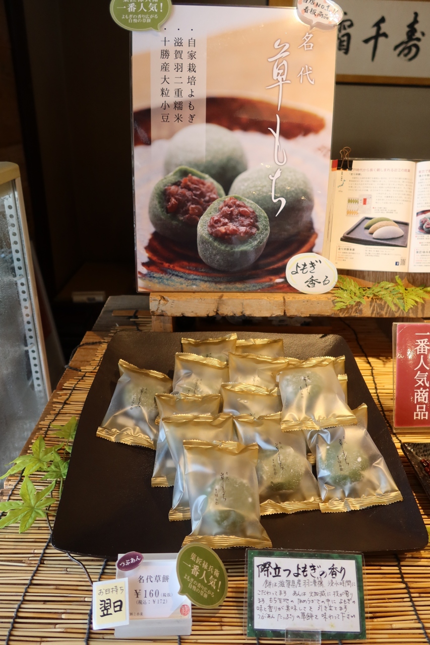 長浜の黒壁スクエア(ガラス館)から西に50m程行った所にある和菓子店です。大正15年の創業で、長浜市内に他にも支店があります。店内には羊羹、カステラ、等々和菓子の種類がとても豊富です。その中でも一番人気なのが草餅。一つづつ包んであり、空けるとヨモギの香りがとても良くとても美味しいです。